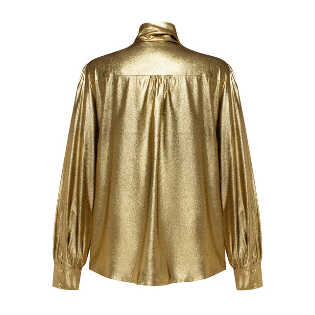 Бажаєте відчути себе стильною та вишуканою? Чудова блуза золотистого відтінку від K&A, яка випромінює енергетику розкоші, стане чудовим вибором. Виконана з шовку Малбері, вона виглядає настільки ошатно, що під неї навіть не потрібні ювелірні вироби – цей виріб сам по собі стає прикрасою. Насичений колір золота та матовий блиск привернуть увагу до господині розкішної блузи, тому їй не вдасться залишитись непоміченою. Привабливою виглядає не тільки тканина, яка добре носиться та зберігає свій вигляд після прання, а й виграшний фасон з елементами декору, який підкреслює лише найкращі сторони фігури. Приміряйте золотисту блузу з темними брюками чи спідницею, і ваш неймовірний образ готовий!