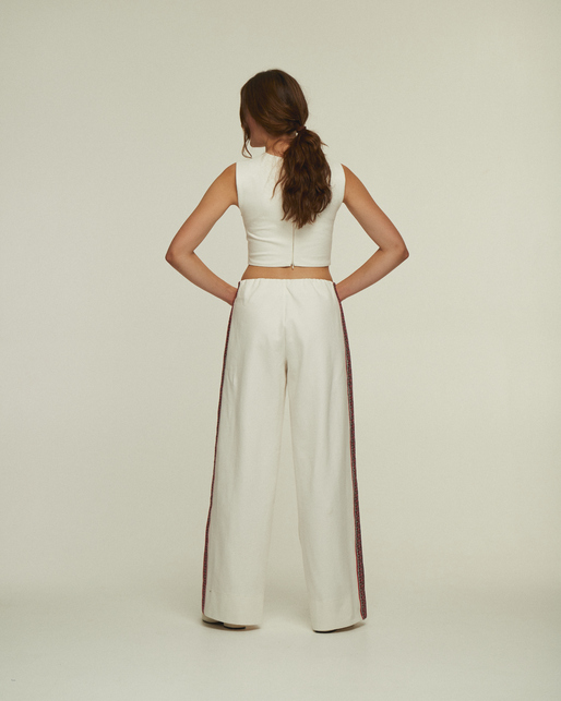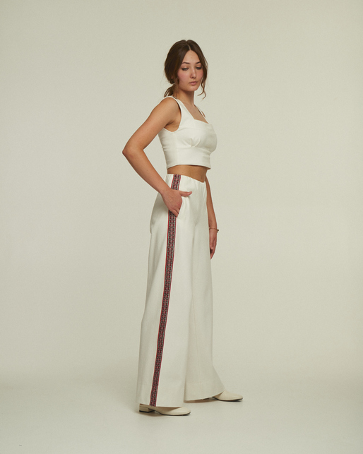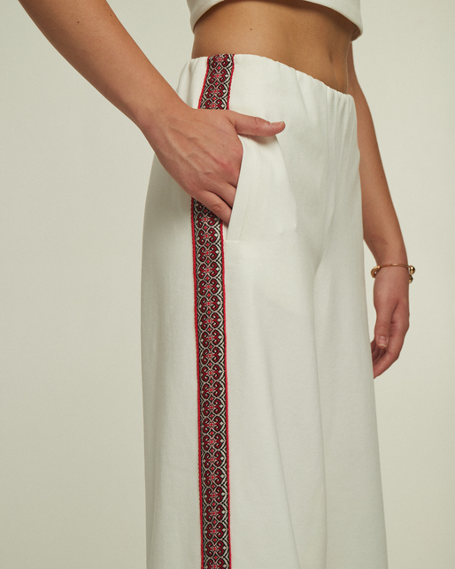 Прямі штани ідеально підходять для тих, хто хоче поєднувати комфорт і стиль. Широкий крій дозволяє вільно рухатися, а приховані глибокі кишені створюють відчуття комфорту. Штани виконані з етнічними деталями з боків, що додає нотки кольору та традиційності простому та елегантному виробу. Бічні лампаси є в зеленому або червоному кольору, а самі штани в класичному чорному та молочному кольорі.