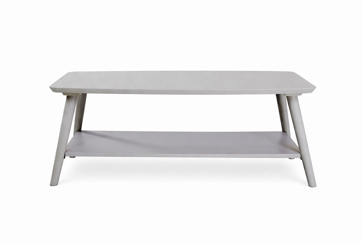 Гарний кавовий столик світло-сірого кольору, столик виконаний в стилі мінімалізму і доповнений полицею знизу.
