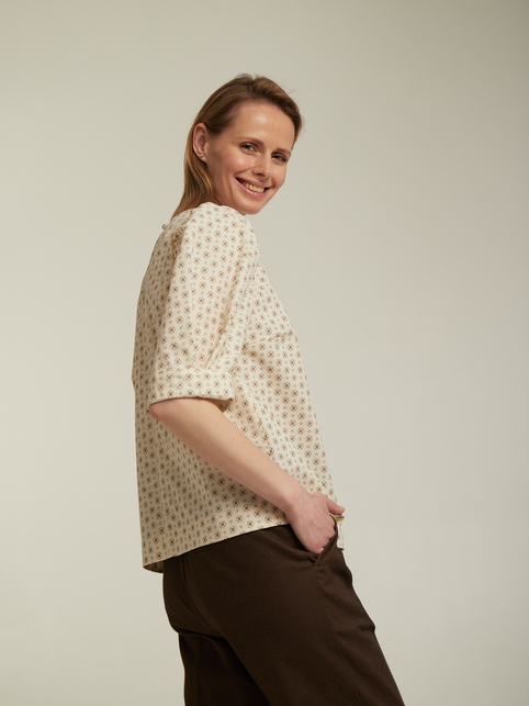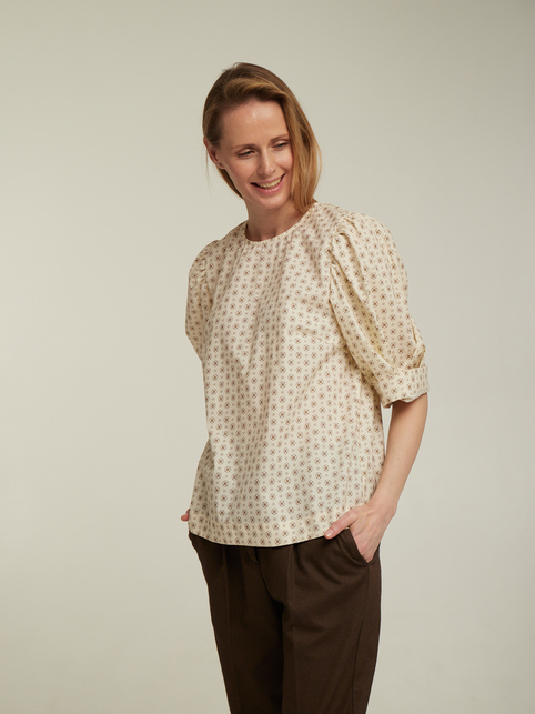 Блуза з рукавом ліхтарик принт - петчворк із колекції Софія. Тканина - іспанська бавовна. Ошатна літня блуза, кремового кольору в білу квіточку. Також у колекції є блуза синього кольору з малюнком петчворк-квіточка