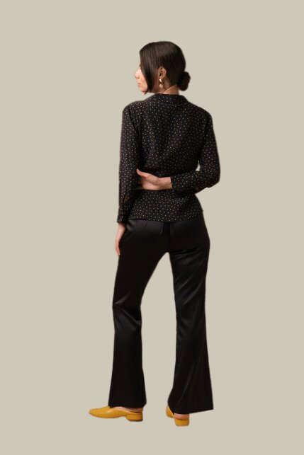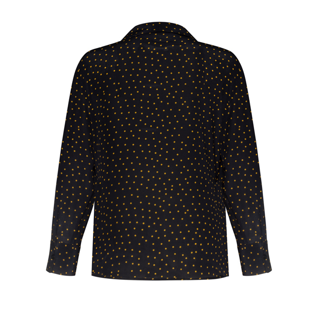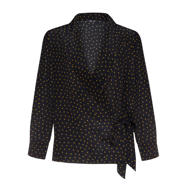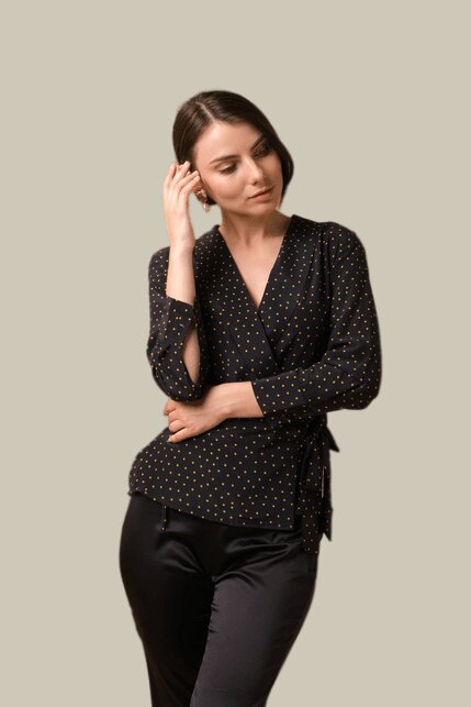 Вишукана легка блуза на запах від ТМ K&A виконана з шовку крепдешину. Шляхетний чорний доповнюється кокетливими цяточками білого кольору, освіжаючи і відтіняючи основний відтінок. Рукава на три чверті відкривають зап'ястя, що дозволяє продемонструвати вишуканий браслет або годинник. Довершує картину ефектна стрічка, яку можна зав'язати у вигляді банта.