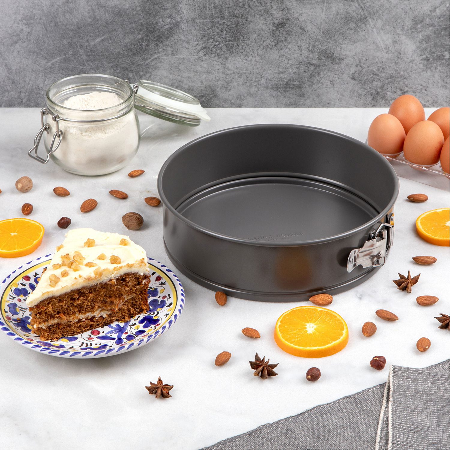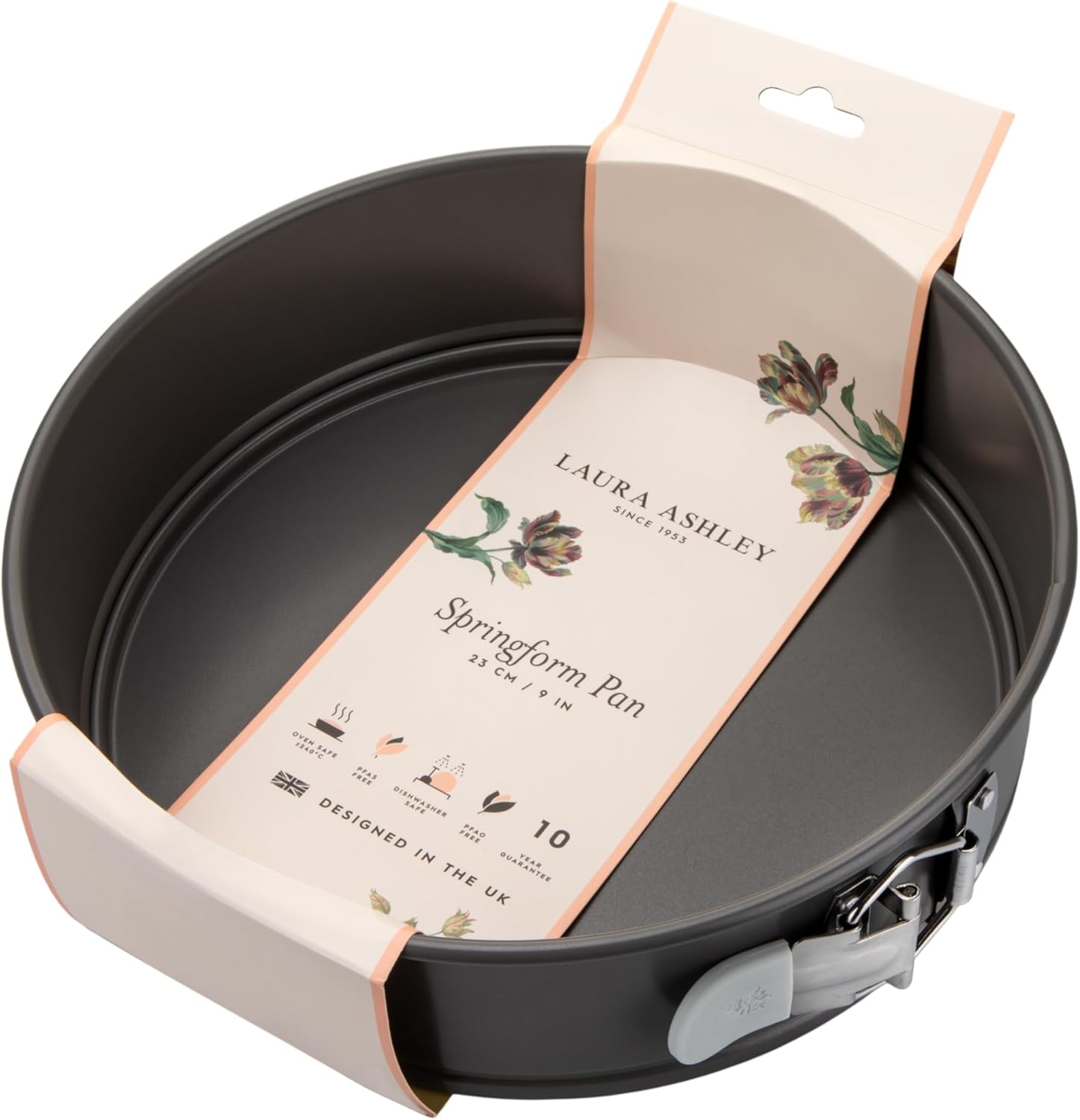 Кругла роз’ємна форма для випічки Laura Ashley – ідеальний вибір для приготування тортів, пирогів та чизкейків. Виготовлена з високоякісного матеріалу з антипригарним покриттям, забезпечує рівномірне випікання та легке виймання готових страв. Стильний дизайн і зручна застібка роблять цю форму незамінною на вашій кухні. Форма для випікання безпечна для духовки при температурі до 240 градусів за Цельсієм і має 10-річну гарантію. Предмети не містять PFAS, а також їх можна мити в посудомийній машині.