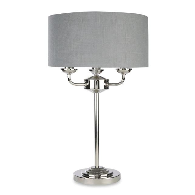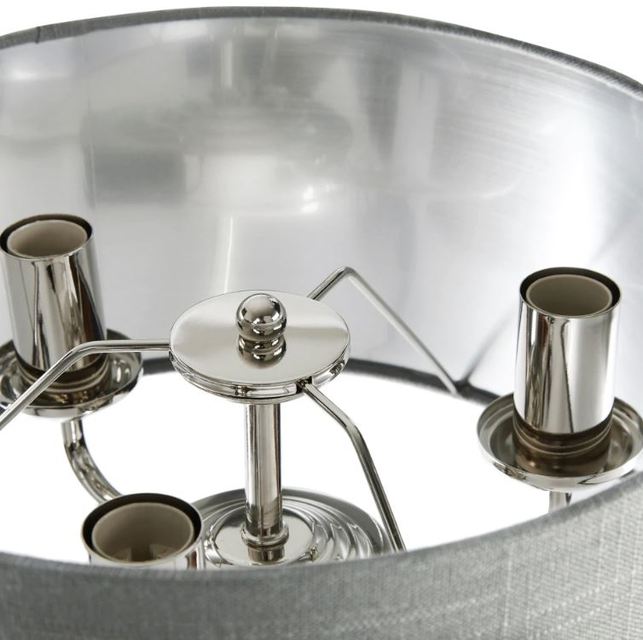 Красива настільна лампа на тонкій ніжці сталевого кольору на три лампочки і одним абажуром темно-сірого кольору.