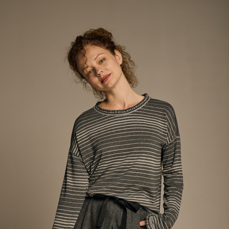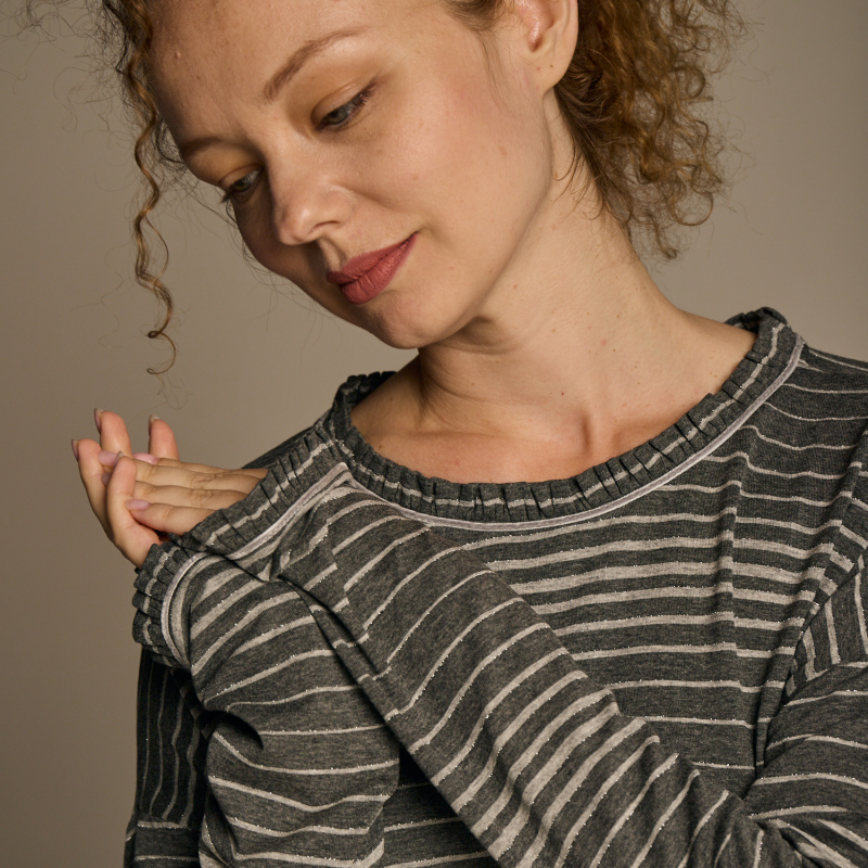Жіноча футболка Лора Ешлі у сіру смужку — це поєднання комфорту, трендового крою та жіночних деталей. Модель має злегка оверсайзний силует і приспущену лінію рукава, що додає легкості та невимушеності образу. Оздоблення у вигляді маленьких рюш-оборок по низу рукавів та горловині надає футболці витонченого шарму та підкреслює її унікальність. Натуральний склад із бавовни та шовку з додаванням еластану забезпечує м’якість, приємність до тіла, еластичність і зручність у щоденному носінні. Така футболка чудово комбінується з джинсами, шортами чи спідницями, підходить як для повсякденного стилю, так і для створення більш романтичних образів.