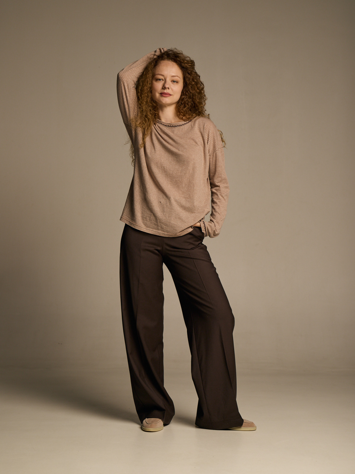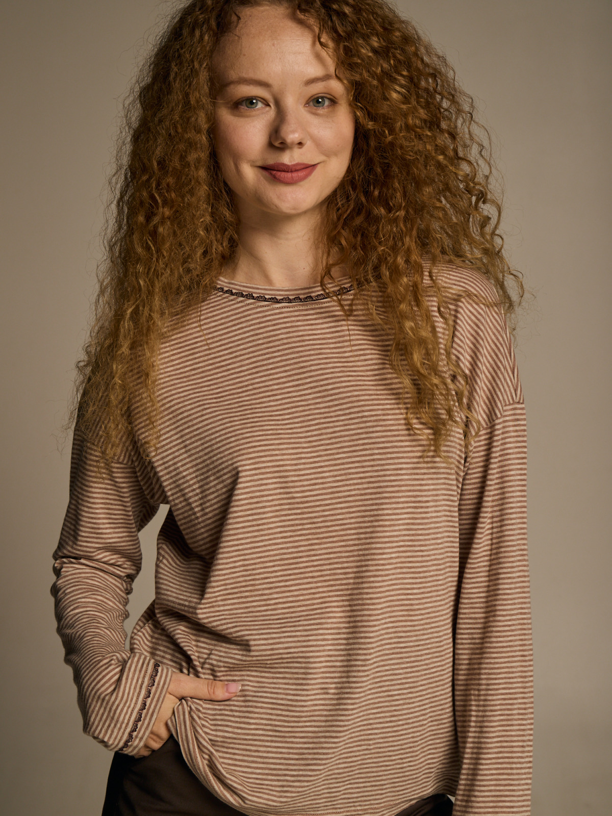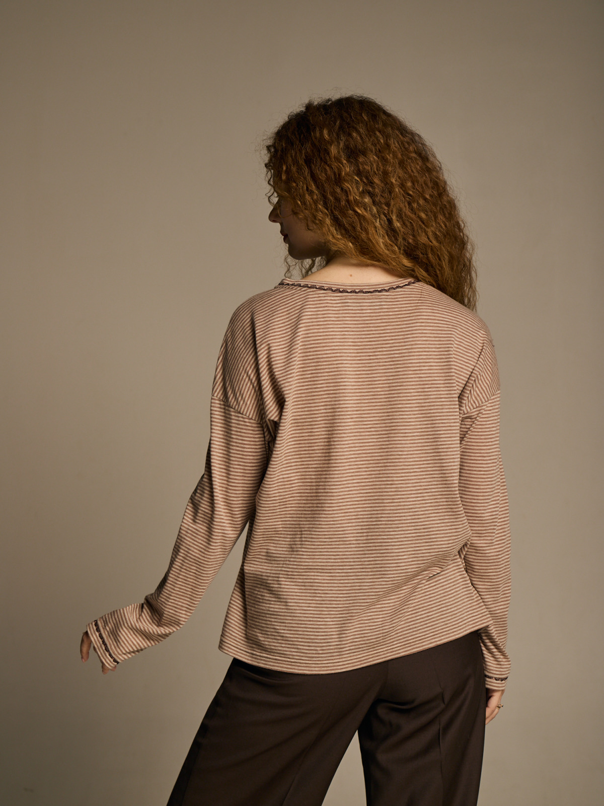 Лонгслів оверсайз в тоненьку коричнево-бежеву смужку