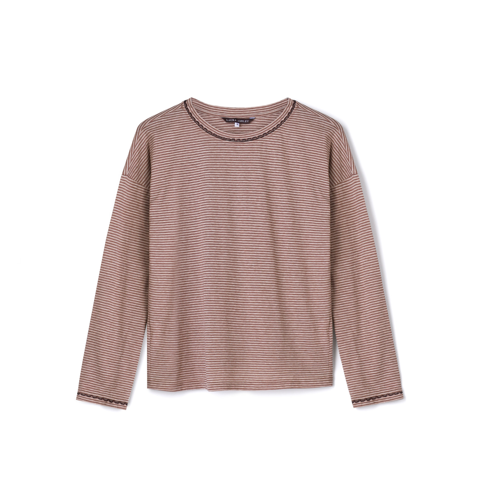 Жіноча футболка Laura Ashley у тоненьку коричневу смужку — це вдале поєднання класики та сучасних деталей. Завдяки злегка оверсайзному крою та приспущеній проймі рукава модель дарує комфорт і невимушений силует. Маленькі рюші-оборки по низу рукава додають легкості, а тонка велюрова стрічка по горловині виступає оригінальним декоративним акцентом. Футболка гармонійно поєднується з джинсами, шортами чи спідницями, підходить як для повсякденного стилю, так і для створення ніжних романтичних образів. Ідеальний вибір для тих, хто цінує практичність, комфорт і елегантні деталі.