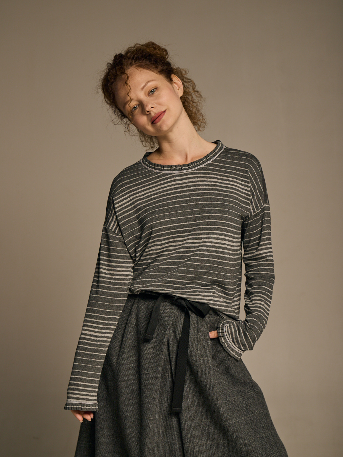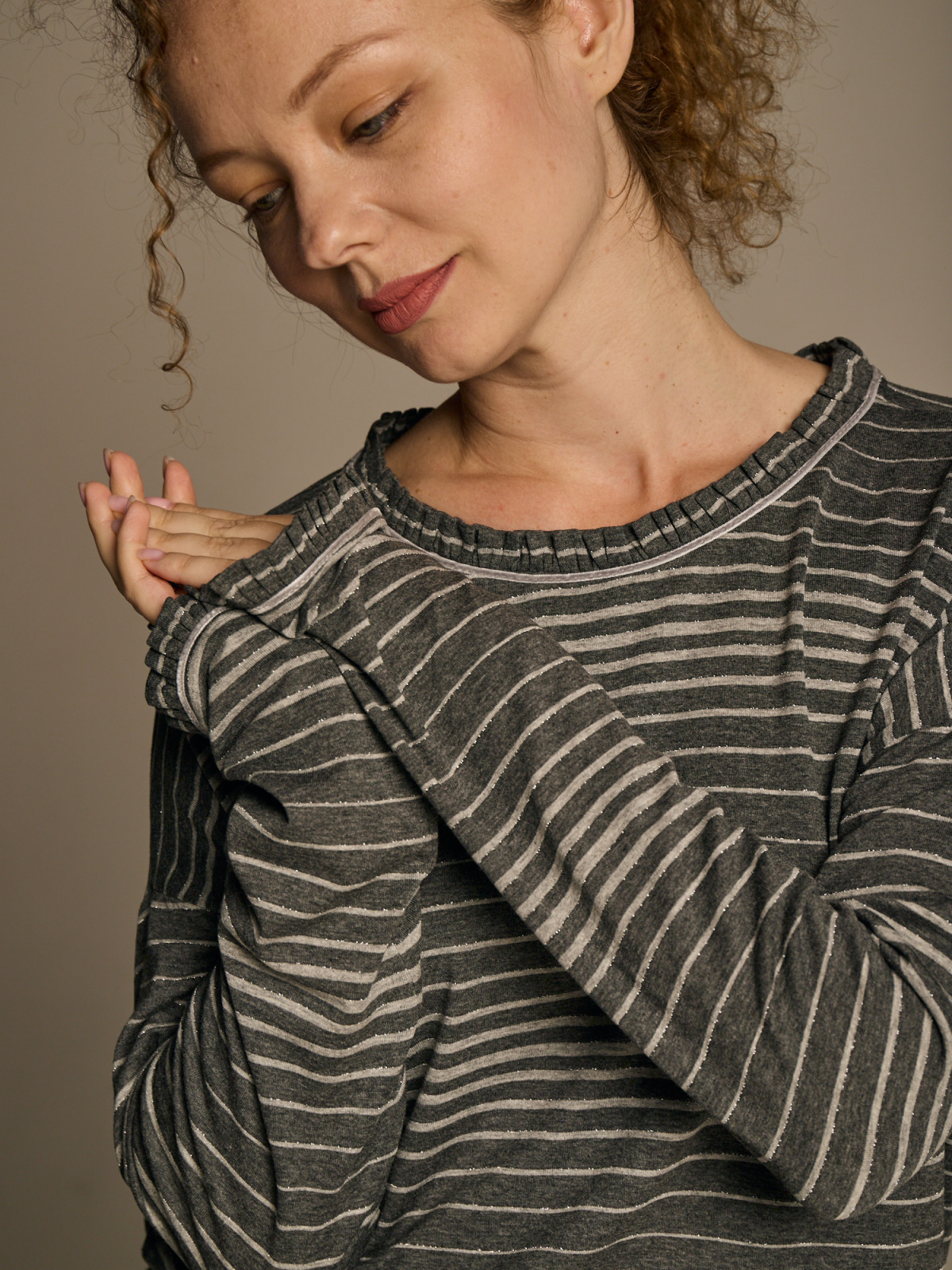 Жіноча футболка Лора Ешлі у сіру смужку — це поєднання комфорту, трендового крою та жіночних деталей. Модель має злегка оверсайзний силует і приспущену лінію рукава, що додає легкості та невимушеності образу. Оздоблення у вигляді маленьких рюш-оборок по низу рукавів та горловині надає футболці витонченого шарму та підкреслює її унікальність. Натуральний склад із бавовни та шовку з додаванням еластану забезпечує м’якість, приємність до тіла, еластичність і зручність у щоденному носінні. Така футболка чудово комбінується з джинсами, шортами чи спідницями, підходить як для повсякденного стилю, так і для створення більш романтичних образів.