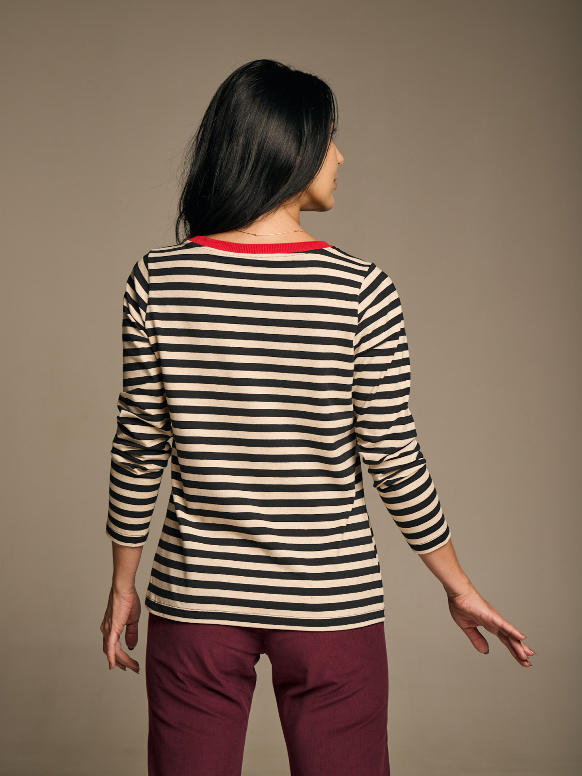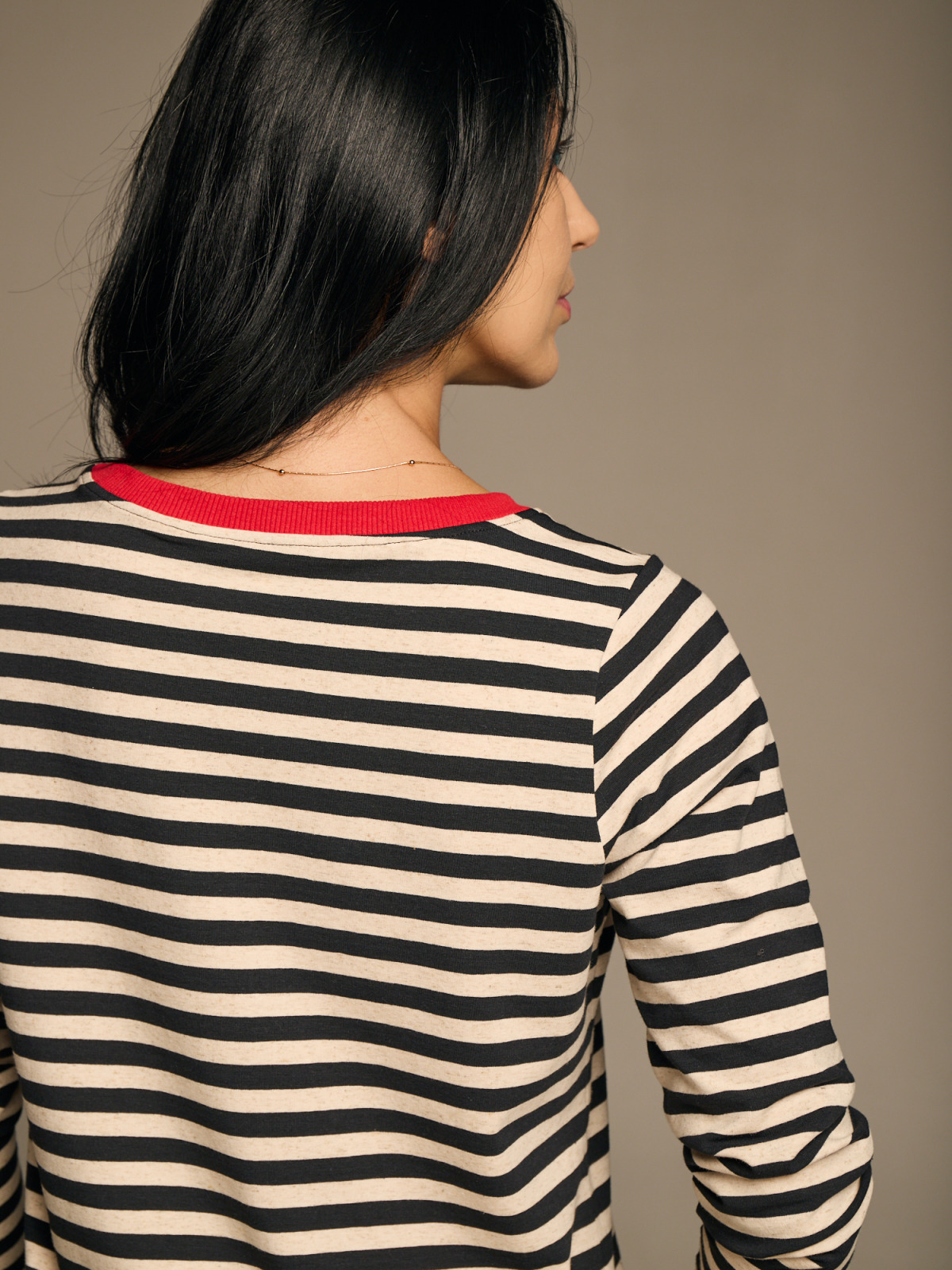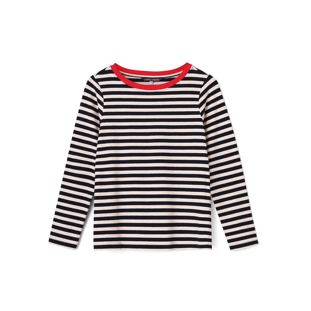 Жіночий лонгслів Laura Ashley у чорно-бежеву смужку — це базова річ, яка поєднує комфорт і вишуканий стиль. Модель має прямий силует і довгий рукав, що робить її універсальною для будь-якої пори року. Контрастна червона окантовка по горловині виступає яскравим декоративним елементом, додаючи енергії та динаміки класичному дизайну. Лонгслів легко комбінується з джинсами, брюками чи спідницями, підходить для створення повсякденних і напівофіційних образів. Натуральний склад тканини забезпечує комфорт у носінні та зручність у догляді.