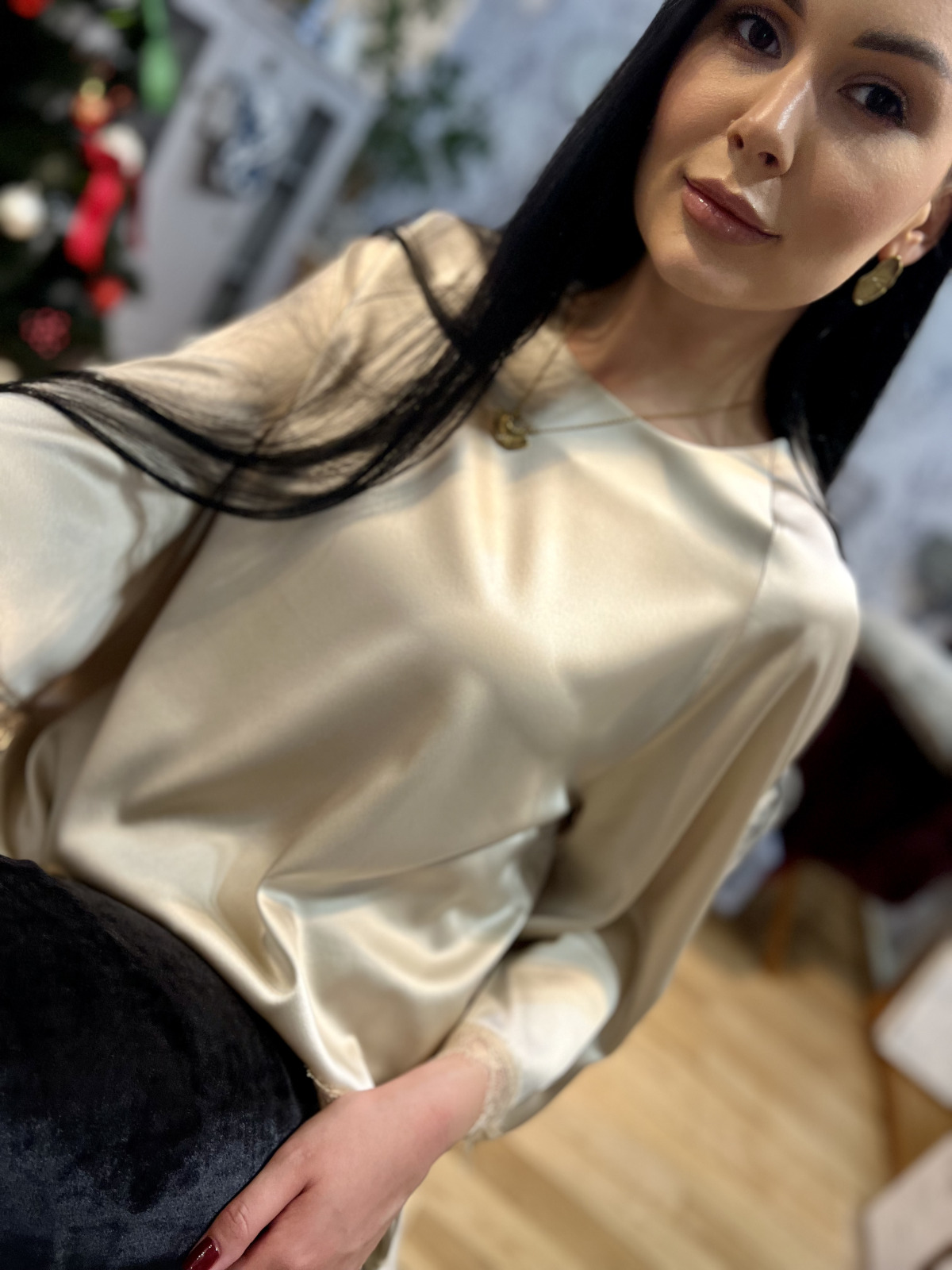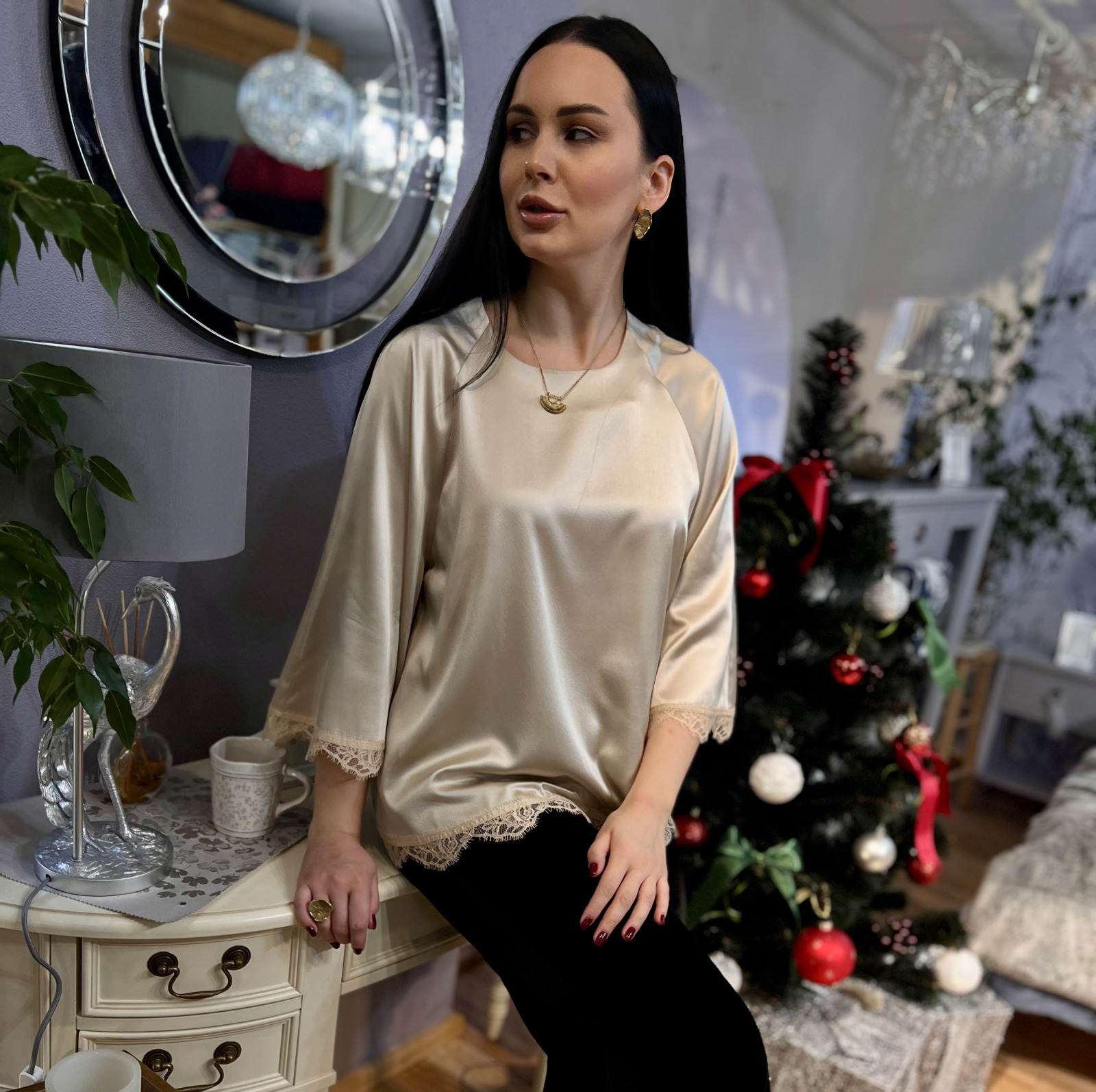 Елегантна вечірня блузка кольору шампанського оздоблена ніжним тонким мереживом по низу рукава та блузки. Приємний на дотик шовк та ніжне мереживо додають вишуканості стилю. Блузка вільного крою з рукавом 3/4 підійде для любої фігури та буде чудовим доповненням до шовкових штанів чи спідниці при створенні ошатного образу.