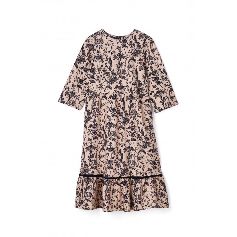 Сукня Laura Ashley з трикотажу у кремово-чорному принті Lloyd — стильний вибір для сучасної жінки, яка цінує комфорт і елегантність. Модель виконана з м’якого трикотажу (бавовна з еластаном), що приємно лягає по фігурі та дарує свободу рухів. Вільний крій із відрізною лінією талії створює збалансований силует, а довжина міді додає жіночності та універсальності. Рукав 3/4 робить образ практичним у будь-яку пору року, тоді як застібка-блискавка по спинці забезпечує зручність у носінні. Оборка по низу сукні надає моделі романтичного характеру, а кишені у бокових швах додають функціональності. Така сукня стане чудовим вибором для повсякденних виходів, зустрічей чи прогулянок, гармонійно поєднуючись як із кросівками, так і з елегантним взуттям.