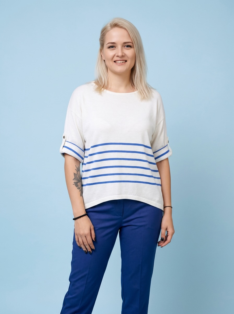 Жіночий пуловер з рукавом 3/4 у горизонтальну смужку з коллекції Enriched Classics — стильна модель у сучасному морському настрої.