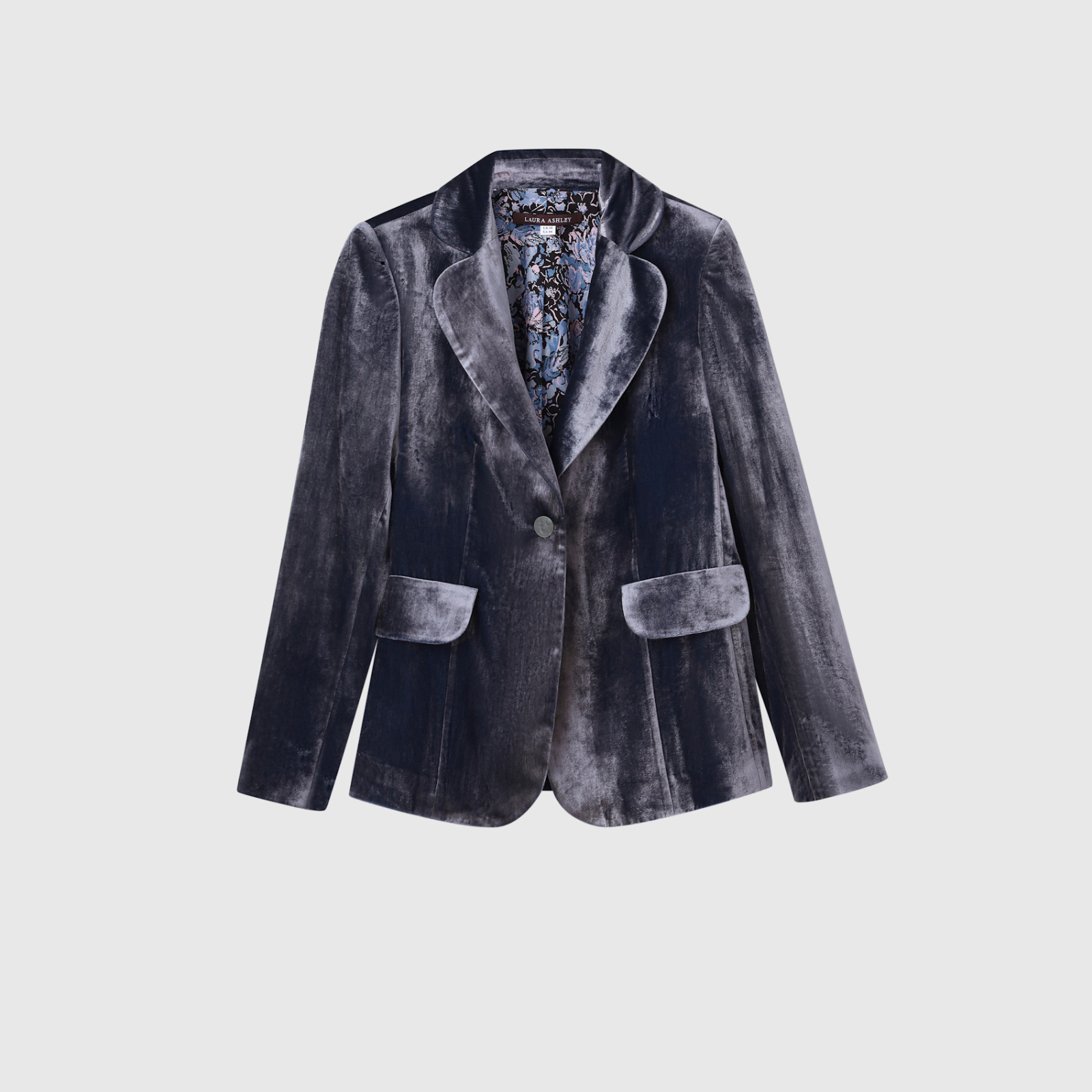 М’який благородний велюр із легким делікатним блиском надає моделі розкішного вигляду, а напівприталений силует формує елегантну жіночну лінію. Однобортна застібка на один гудзик робить жакет лаконічним та сучасним, підкреслюючи стриману британську естетику бренду.