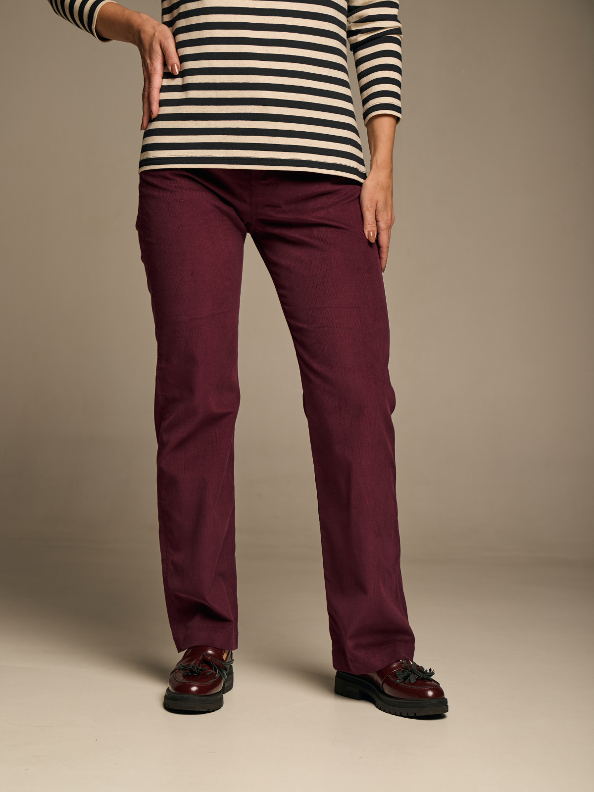Жіночі джинси з мікровельвету Laura Ashley у благородному відтінку бургунді — стильна альтернатива класичному деніму. Прямий крій, середня посадка по талії та щільна фактурна тканина створюють комфортну та вишукану посадку. Ідеальні для осінніх образів. Доповненням до джинсів ми пропонуємо сорочку з такого ж мікровельвету.