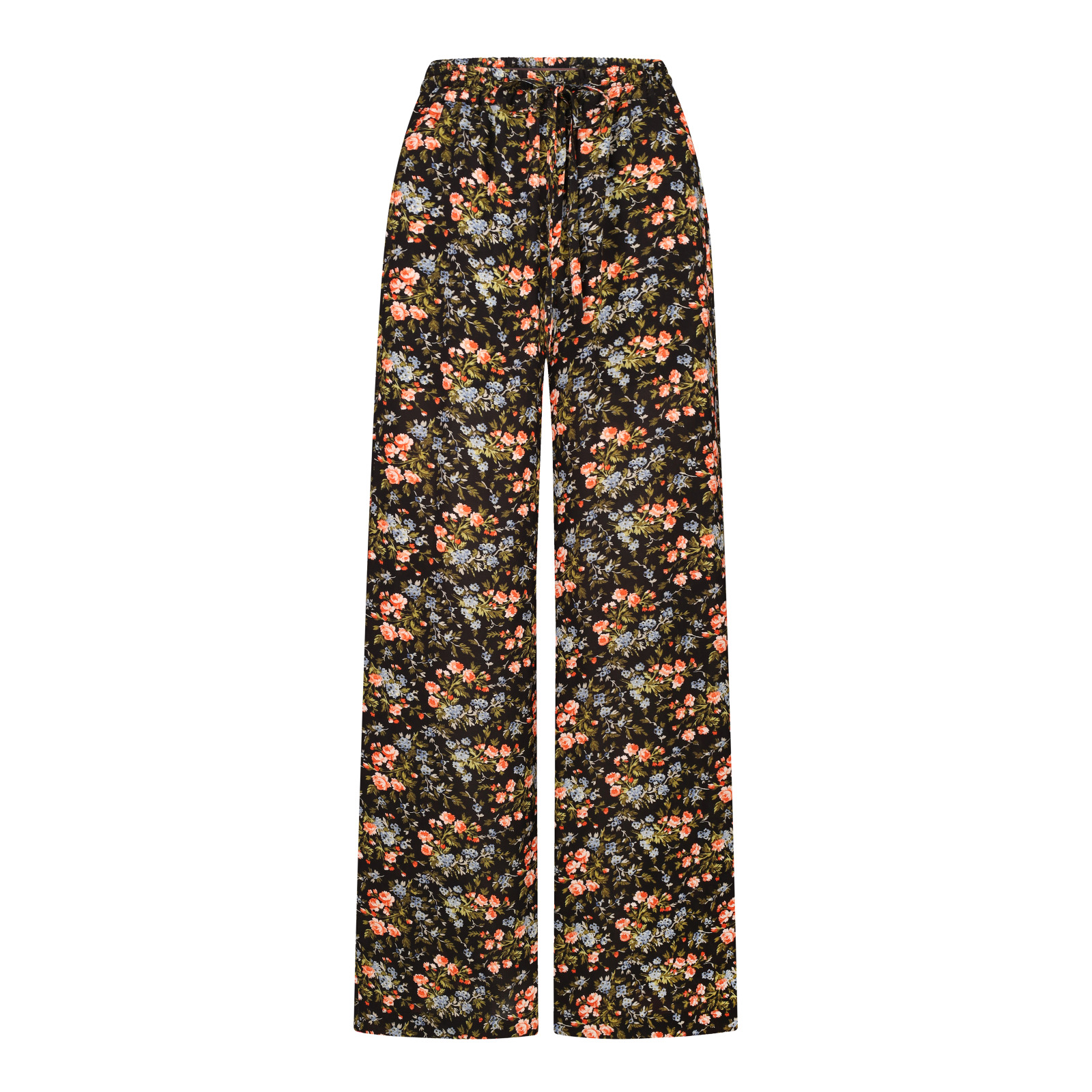Жіночі штани палаццо з легкої віскози - стильна й комфортна база для міжсезонного гардерлба. Чорний фон прикрашений вишуканим дрібним квітковим принтом Elerby від бренду Laura Ashley, що додає образу романтичності та вишуканості. Модель має еластичний пояс на резинці для ідеальної посадки та зручні кишені в бічних швах. Широкі та вільні брюки палаццо забезпечують максимальний комфорт та красиво струменіють під час руху. Ці чорні жіночі штани з квітковим принтом легко поєднувати з базовими футболками, сорочками та топами. Для створення гармонійного total look ми пропонуємо до вибору дві блузки з таким самим принтом Elerby.