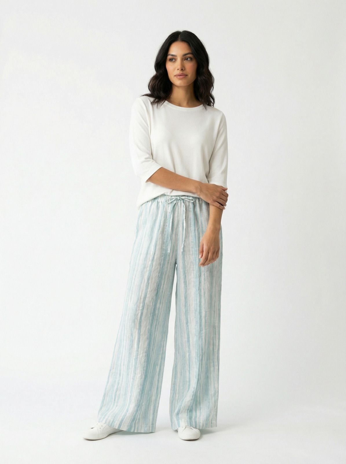 Легкі, дихаючі та елегантні, ці штани чудово поєднуються з лляною сорочкою з тієї ж тканини, створюючи стильний комплект для відпочинку, прогулянок або подорожей.