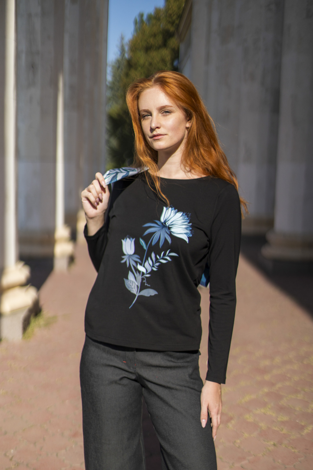 Стильна чорна футболка-лонгслів з виразним квітковим принтом Акваманин. Це незамінна річ в гардеробі цієї осені. Унікальний лімітований принт на футболці підкреслить вашу індивідуальність. Вона ідеально підійде до джинсів або любих чорних штанів. Щоб довершити образ, пропонуємо велику гарну хустку з таким же принтом Аквамарин. В такому вбранні ви будете виглядати впевненно та неперевершено.