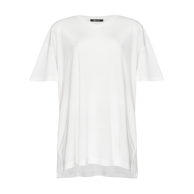 Білосніжна футболка від K&A з коротким рукавом і круглим коміром виконана з якісного шовку Малбері. Вільний крій дозволить приховати недоліки фігури, а приємна до тіла тканина створить відчуття комфорту. У настільки ефектної речі можна відправитися на прогулянку або на зустріч з друзями.