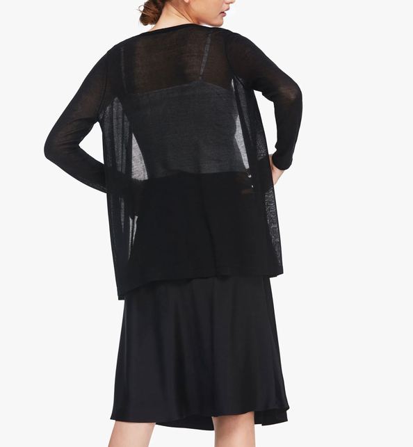 Легкий шовковий кардиган K&A виглядає стильно та ефектно за рахунок виграшного крою, який візуально робить стрункішою навіть даму з пишними формами. Чорний колір дозволяє приховати недоліки фігури та чудово поєднується з різними відтінками завдяки універсальності. Кардиган має подовжений крій, що робить будь-яку леді більш витонченою та надає їй елегантності. Виріб може стати частиною ділового стилю – для цього достатньо підібрати ефектну блузку та штани світлого кольору. Кардіган від K&A також доповнить повсякденний образ, чудово поєднуючись з джинсами, сукнями та брюками різного фасону. Така річ обов'язково має бути в гардеробі кожної леді, яка стежить за модними тенденціями, цінує якість та хоче йти в ногу з часом.