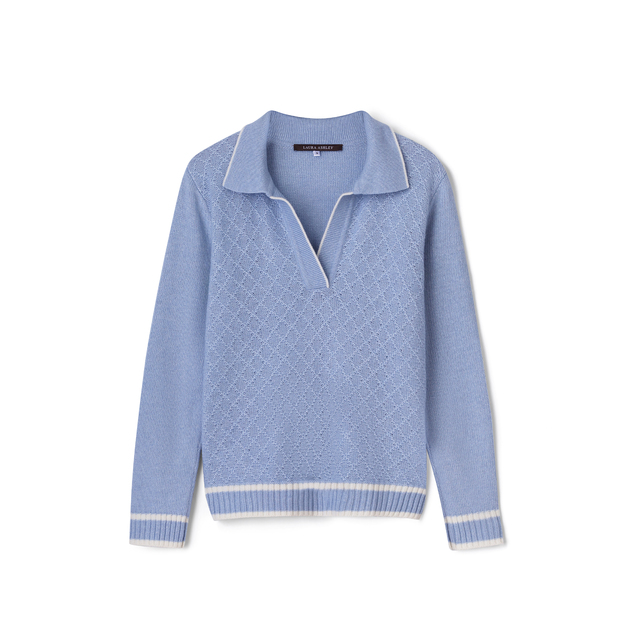 Жіночий пуловер-поло у трендовому блакитному відтінку — це стильна та універсальна річ для будь-якого гардероба. Контрастна біла оздоблювальна смужка на манжетах, комірці та по низу виробу додає модного акценту та робить силует більш виразним. Передня частина прикрашена візерунчастою ромбовою в’язкою, що створює ефектний і водночас витончений вигляд. Завдяки складу тканини пуловер поєднує в собі тепло натуральної вовни, м’якість і шовковистість віскози та практичність акрилу. Модель легко комбінується як з брюками, так і зі спідницями чи джинсами, і чудово підходить для повсякденного стилю, офісних образів або вихідних прогулянок.