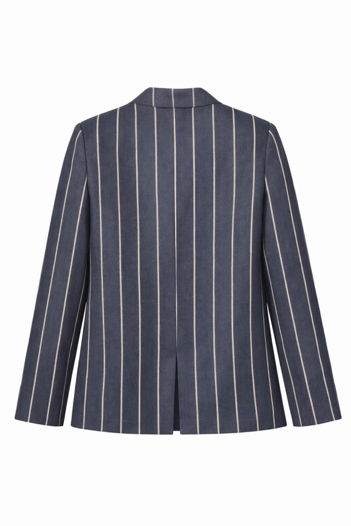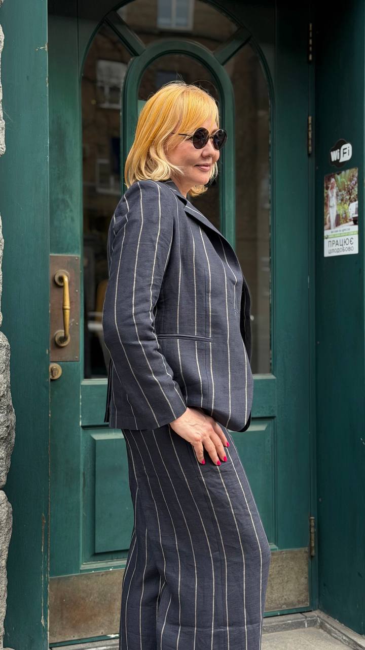 Елегантний жіночий лляний жакет з колекції Formal Linen— стильна база для сучасного гардероба у класичному та casual chic стилі. Модель виконана у благородному темно-синьому кольорі в тонку смужку, що додає образу витонченості та стриманої елегантності. Жакет має однобортний крій із застібкою на один гудзик, що підкреслює лаконічний дизайн та актуальний силует. Шліца по спинці забезпечує комфорт під час руху та ідеальну посадку. Функціональні кишені типу “лісточка” додають виробу акуратного класичного вигляду. Для зручності передбачена часткова батистова підкладка, яка робить жакет легким і комфортним навіть у теплу пору року.