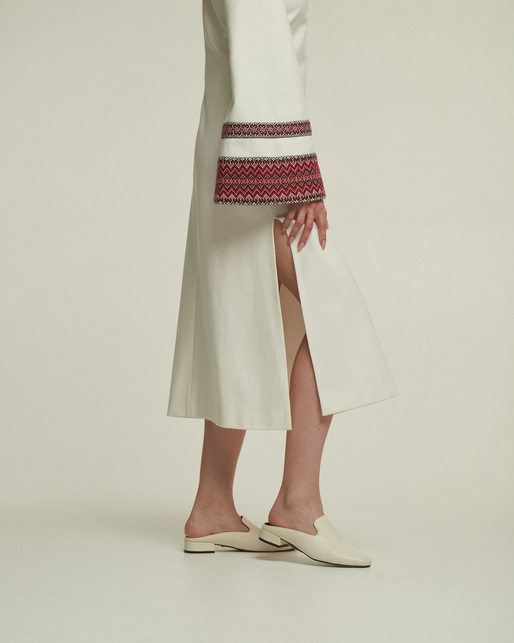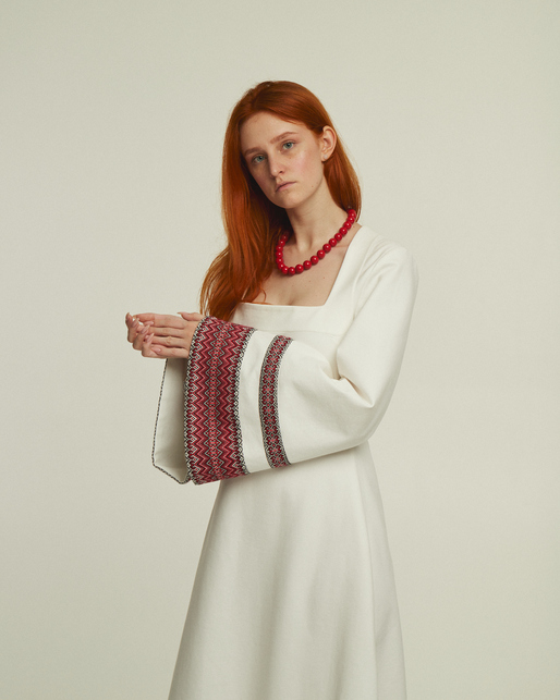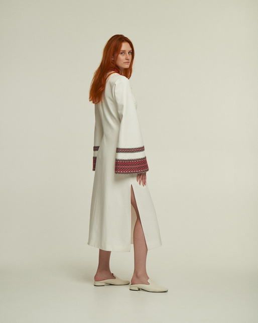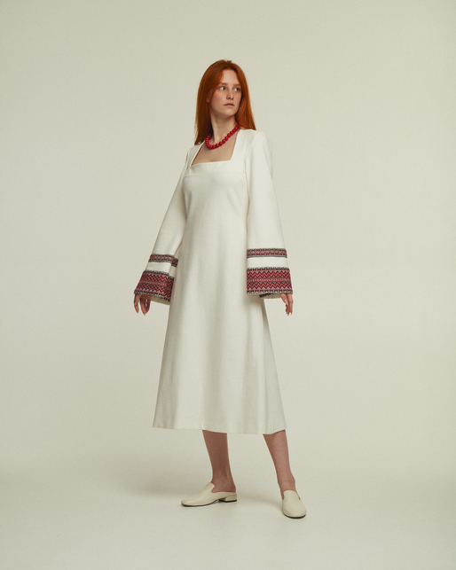 Довга та ніжна сукня, яка привертає увагу своєю яскравою, але елегантною формою та довгими широкими рукавами з декором. Самі рукава прикрашені орнаментом червоного або зеленого кольору, які доповнюють просту сукню. Талія підкреслена формою пісочного годинника, проте сукня вільна в стегнах і плечах, що забезпечує комфорт у витонченому образі. Сама сукня представлена в двох класичних кольорах - чорному та молочному.