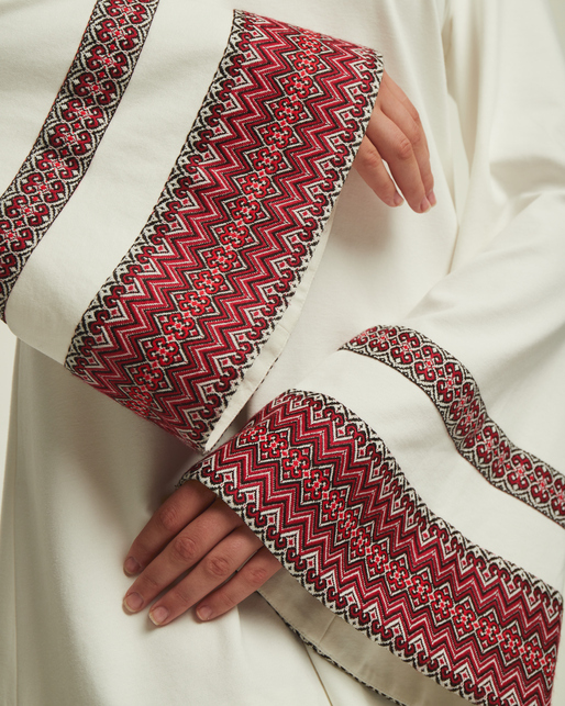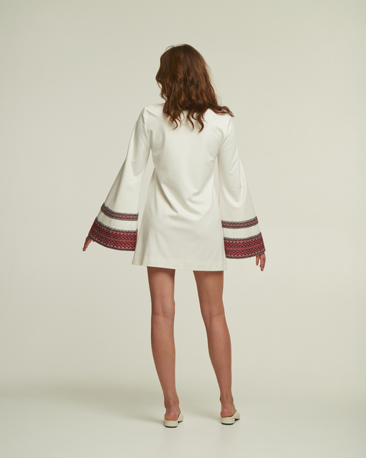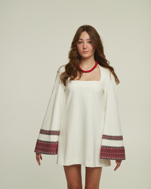 Модернізований образ, що поєднує красу етнічних мотивів у сучасній сукні. Коротка сукня-трапеція має довгі рукава, прикрашені традиційним орнаментом, що створює стильний, та вражаючий образ. Орнамент на рукавах представлено у двох кольорах, традиційному червоному та ніжно-зеленому, а сама сукня у класичних чорному та молочному кольорі.