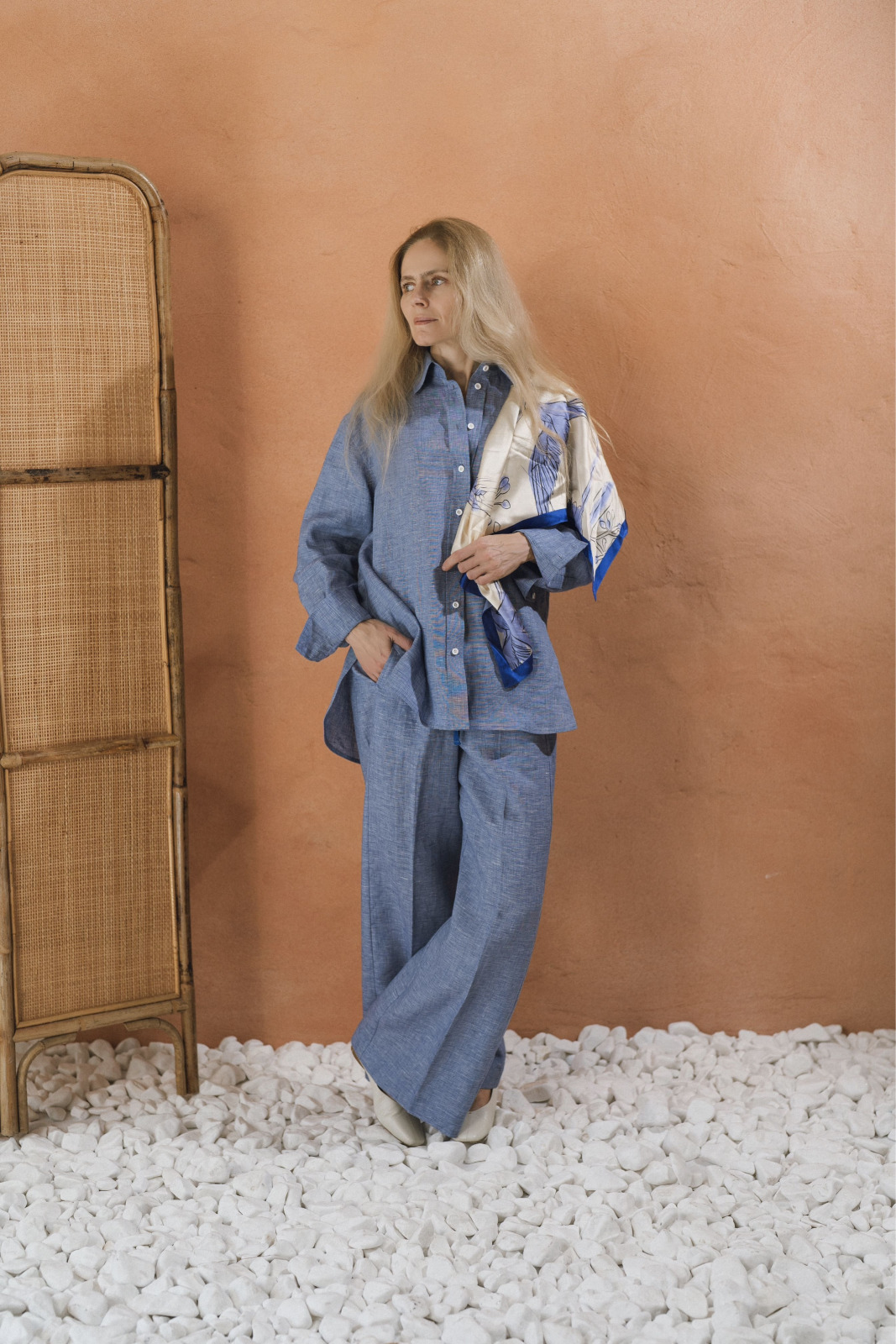 Пропонуючи свіжий погляд на традиційні лляні сорочки, цей виріб ідеально поєднує в собі чоловічий і жіночий стиль: розслаблений фасон бойфренда в класичному синьому кольорі. До цієї сорочки ми пропонуємо сині широкі лляні штани, які обєднуються в комплект. Доповнити образ можна невеличкою сумочкою кросбоді з біло-блакитним принтом Сойка та Конюшина і ви готові до прогулянки та відпочинку.
