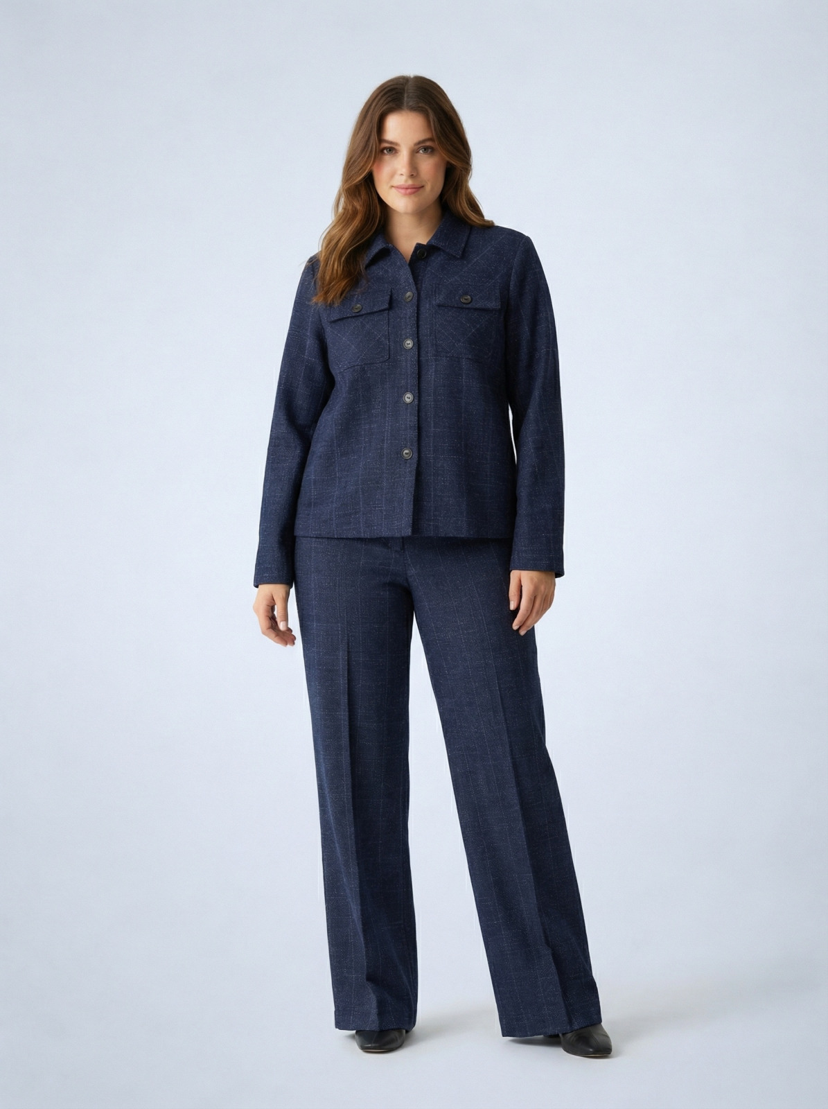 Модель ідеально поєднується зі штанами вільного крою з комплекту, формуючи завершений костюмний образ.