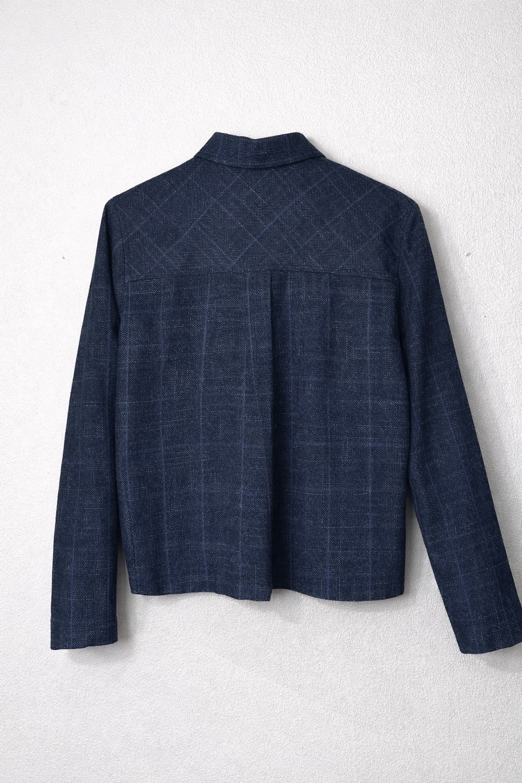 Укорочений жакет — вишукана модель у класичному синьому кольорі з делікатною клітинкою.