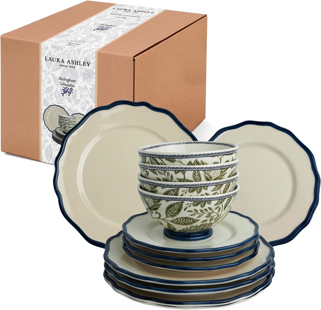 Привнесіть до свого столу відтінок позачасової елегантності за допомогою столового посуду Laura Ashley Hedingham із 12 предметів в кольорі зеленого шавлії. У цьому наборі є чудові тарілки та піали, натхненні традиційними друкованими візерунками, з розписаним вручну синім обідком для тонко елегантного завершення. Виготовлений із міцної кераміки, цей набір поєднує в собі міцність і стиль для щоденного використання та особливих випадків. Додайте до них чашки з таким же зеленим принтом і ви маєте розширений столовий сервіз.