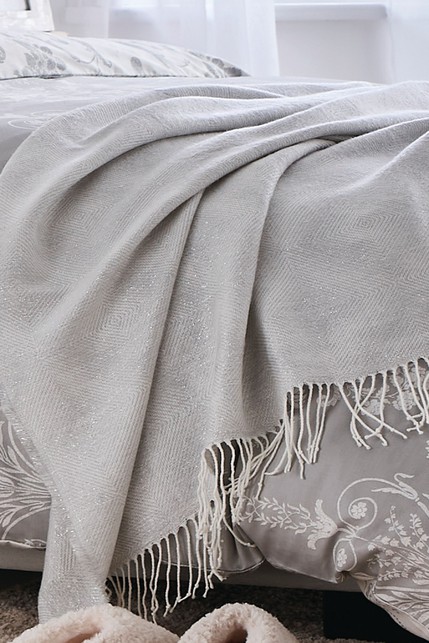 Стильний плед ніжно сірого кольору, цей плед здивує Вас не тільки своєю красою, а й м'якістю на дотик. Плед доповнений бахромою з боків