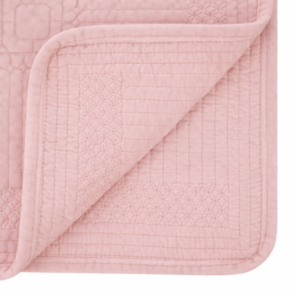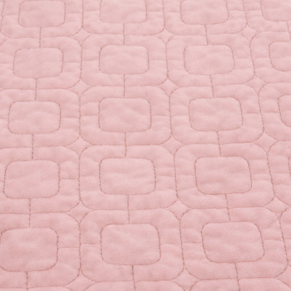 Велике покривало ніжно-рожевого кольору, стьобане по всьому периметру квадратами із закругленими кутами.