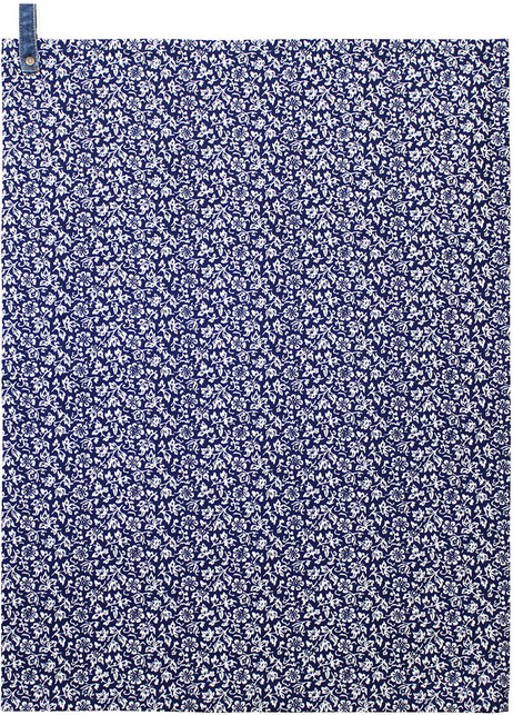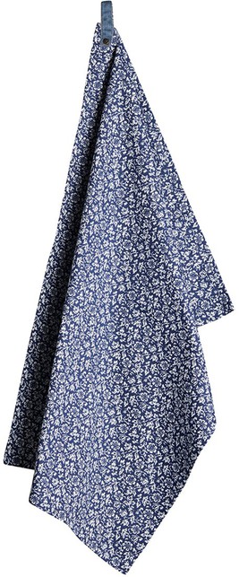 Кухонний рушник із чистої бавовни темно-синього кольору з дрібним квітковим малюнком білого кольору.