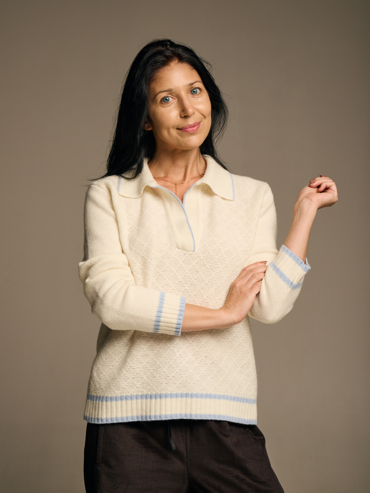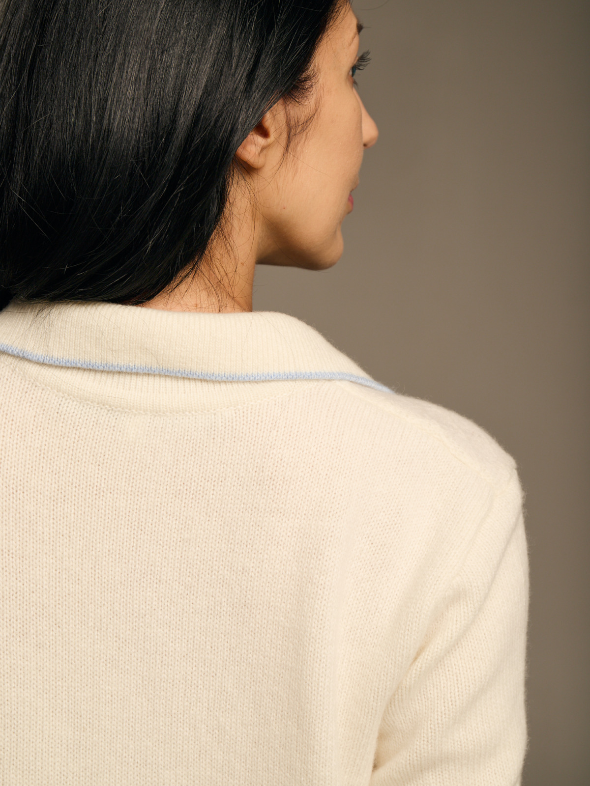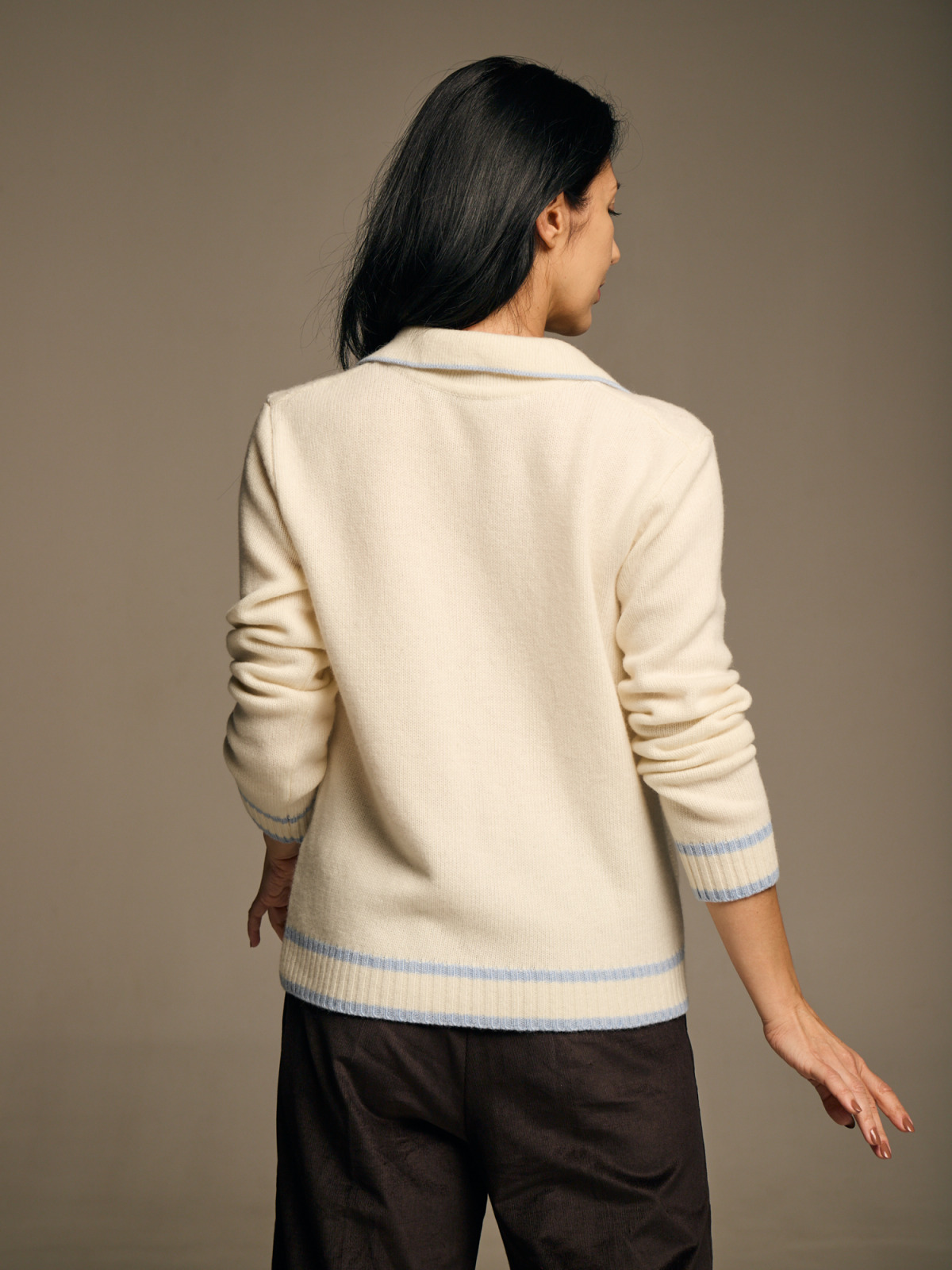 Жіночий пуловер-поло з вовни ягняти — стильний вибір для тих, хто цінує натуральність, комфорт і витонченість. Модель виконана у класичному молочному кольорі з тонкою блакитною смужкою по низу виробу, манжетах і комірцю, що додає легкості та ніжності образу. Особливу елегантність пуловеру надає візерунчата ромбова в’язка, розташована лише на передній частині, яка створює відчуття ексклюзивності. Завдяки м’якій вовні ягняти виріб дарує тепло, дихання тканини та довговічність. Такий пуловер-поло легко комбінується як з класичними брюками, так і з джинсами чи спідницями, і стане універсальним елементом гардероба для офісу, прогулянок та зустрічей.