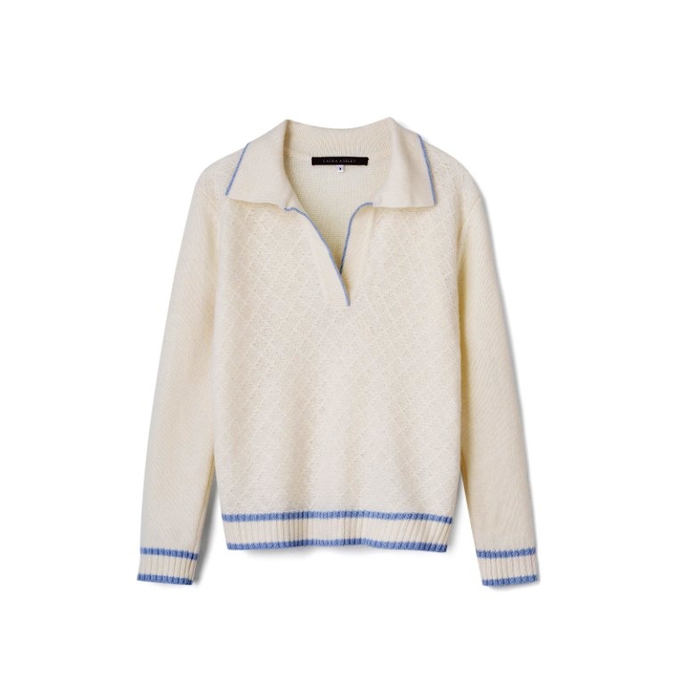 Жіночий пуловер-поло з вовни ягняти — стильний вибір для тих, хто цінує натуральність, комфорт і витонченість. Модель виконана у класичному молочному кольорі з тонкою блакитною смужкою по низу виробу, манжетах і комірцю, що додає легкості та ніжності образу. Особливу елегантність пуловеру надає візерунчата ромбова в’язка, розташована лише на передній частині, яка створює відчуття ексклюзивності. Завдяки м’якій вовні ягняти виріб дарує тепло, дихання тканини та довговічність. Такий пуловер-поло легко комбінується як з класичними брюками, так і з джинсами чи спідницями, і стане універсальним елементом гардероба для офісу, прогулянок та зустрічей.