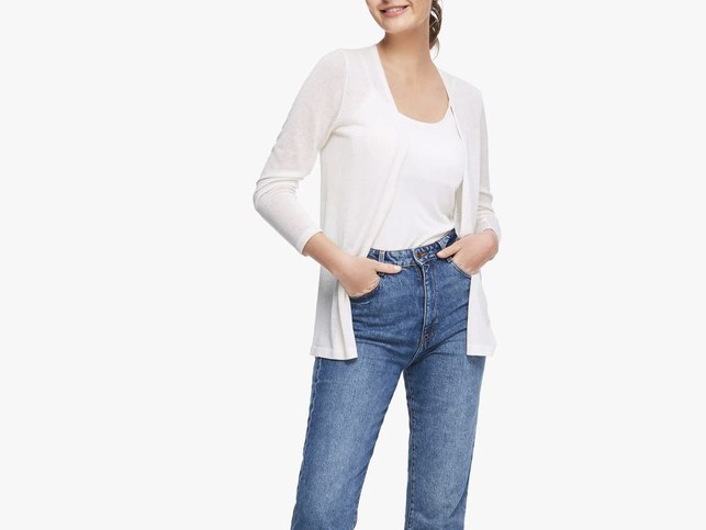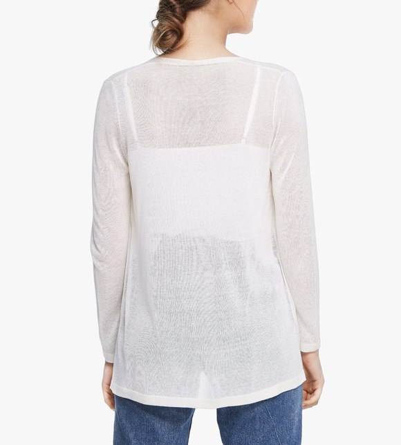 Шовковий, майже невагомий кардиган від K&A виглядає ошатно і дорого внаслідок вдалого крою, який візуально витягує силует. Особливість виробу — гарний білий колір, який виглядає виграшно та здатний прикрасити блондинку і брюнетку. Він освіжає та надає образу легкості. При цьому подовжений крій дозволяє приховати недоліки фігури, відволікаючи увагу від надмірно пишних стегон або широкої талії. Елегантний виріб може стати частиною ділового та повсякденного образу, якщо до нього підібрати вишукану сукню, пару стильних штанів або гарні джинси з темною футболкою. Хоч кардиган від K&A світлого відтінку, він добре поводить себе під час прання. Такий виріб обов'язково має бути в гардеробі кожної жінки, яка стежить за модними тенденціями, цінує якість та прагне йти в ногу з часом.