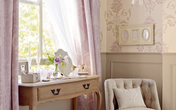 Малюнок дуже химерний і добре підійде для класичного інтер'єру спальні, вітальні чи дитячої кімнати. На таких шпалерах красиво виглядають дзеркала в бежевій, широкій рамі.