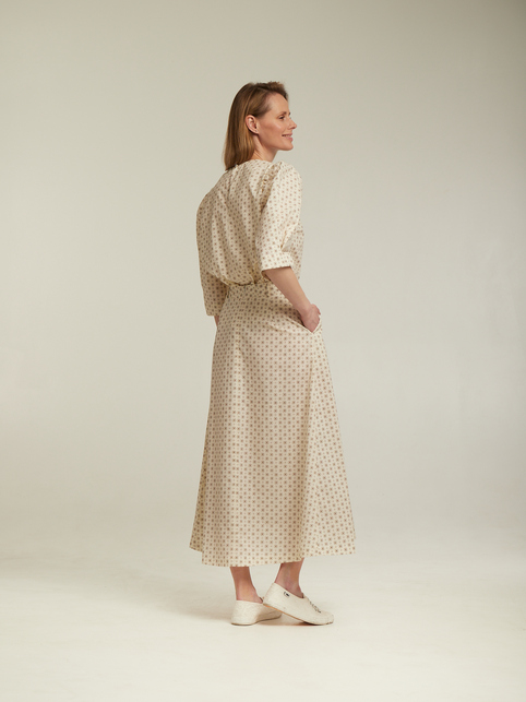 Спідниці мають довжину міді та асиметричну глибоку зустрічну складку. Щільна бавовна тримає форму та створює романтичний А-силует. У бічних швах заховані зручні кишені. Застібка на гудзик та змійку по задньому шву спідниці.