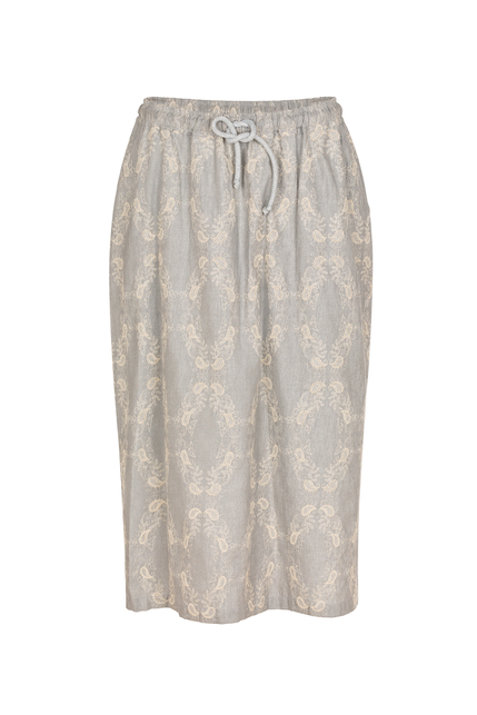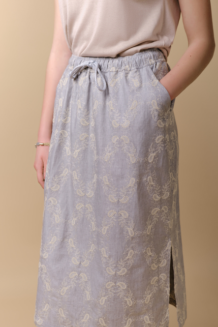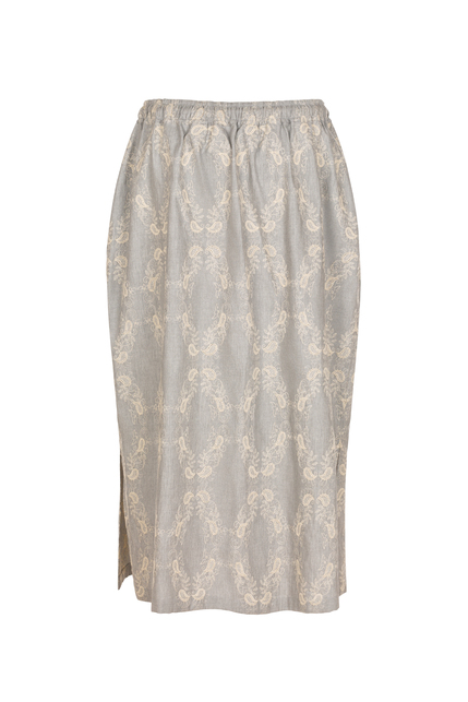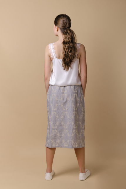 Комфортна, зручна та дуже інтелігентна спідниця світло-сірого кольору з пшеничною вишивкою зі 100% іспанської бавовни. Спідниця зручна тим, що вона міді довжини, нижче коліна, має розрізи з боків, дозволяючи ходити як у кедах, так і в балетках або мюлях. Модель на гумці в талії, підходить на будь-яку фігуру та розмір. Ми такі моделі називаємо жартома « пляж, лазня , ресторан», за рахунок її універсальності та зручності