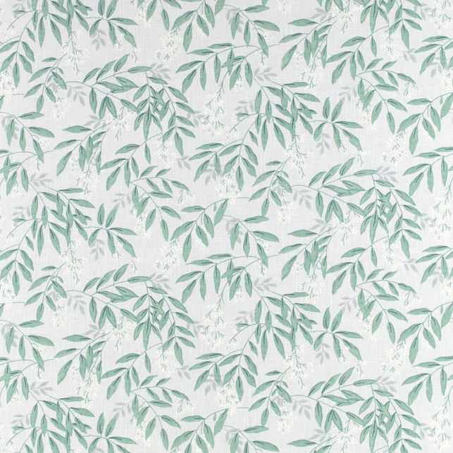 Красива тканина для штор з малюнком великих листочків зеленого кольору з білими ягодами омели.