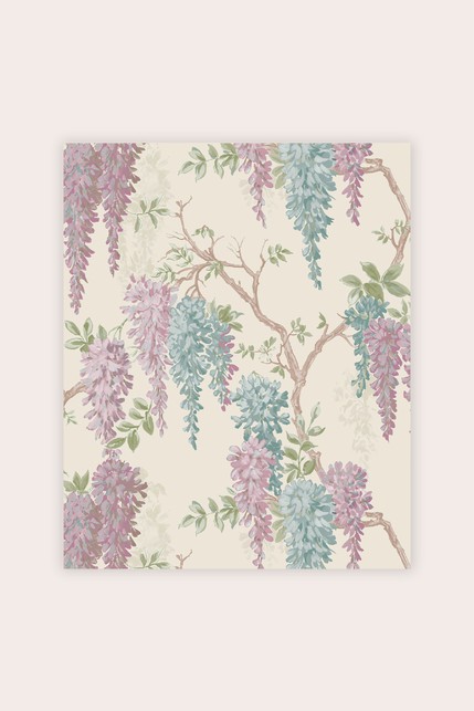 Паперові шпалери з красивим малюнком квітів гліцинії ніжно-блакитного і бузкового кольору, малюнок шпалер схожий на ніжний акверельний живопис.