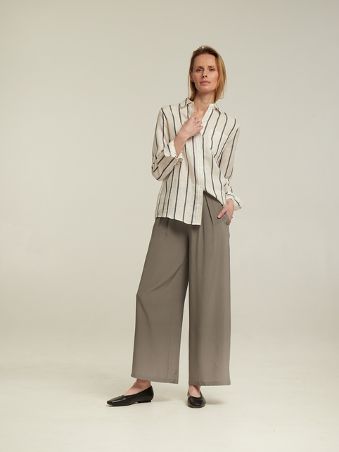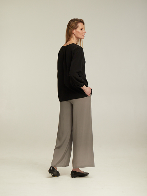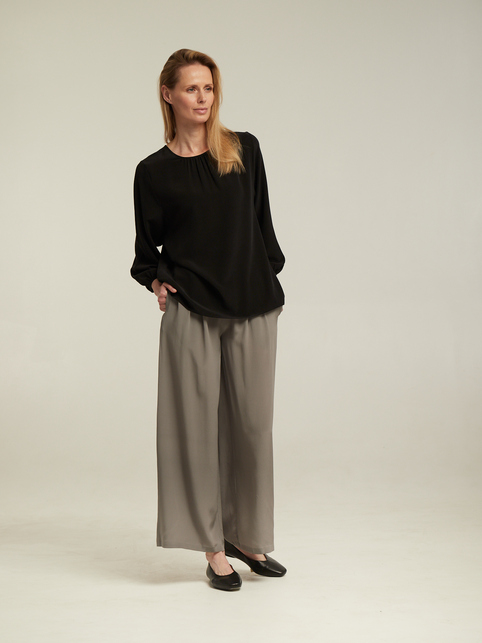 Прямі шовкові брюки з натурального шовку від ТМ K&A - відмінне доповнення вашого гардеробу. Перлинно-сірий колір і фактура крепдешину дозволяють м'яко підкреслити деталі фасону. Приховані в бічних швах кишені практично не помітні, але при цьому функціональні. Високий м'який пояс і зустрічні складки роблять вашу талію тоншою і візуально витягають силует. Ці штани прекрасно поєднуються з елегантними шовковими сорочками і органічно виглядають з невеликими топами під кардиган або скорочену курточку. Купити їх можна в нашому магазині.