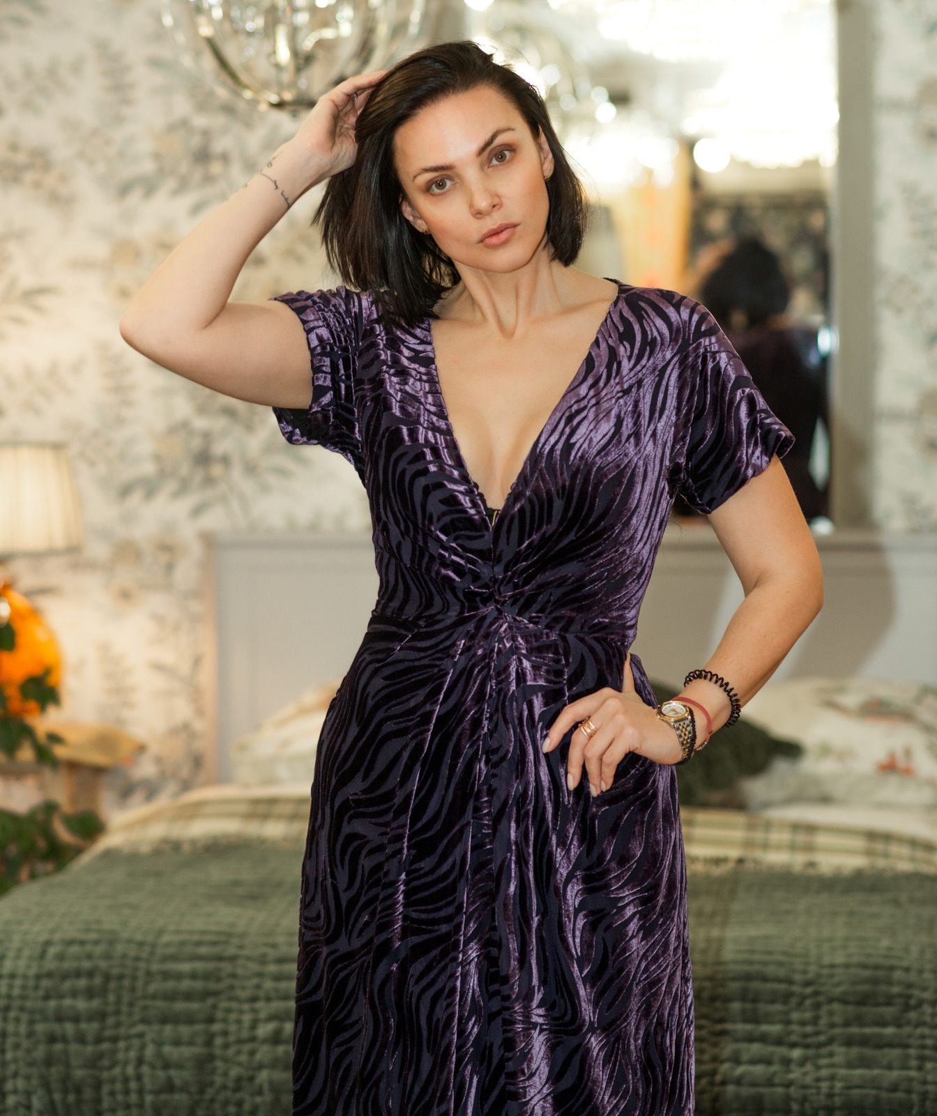 Легкий шовк-деворе, що струмує, з благородним переливом формує розкішний образ, а віскозна підкладка забезпечує комфорт і м'яке прилягання до тіла.