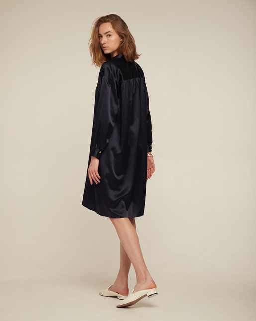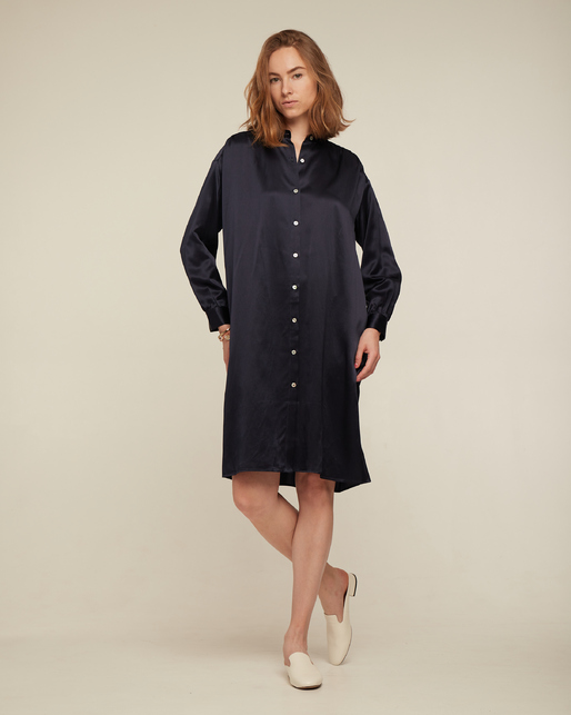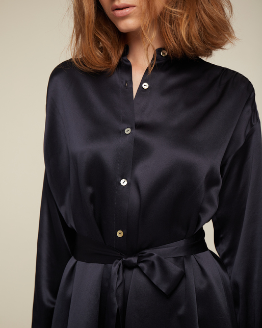 Елегантне плаття з шовку Шармез від бренду K&A стане відмінним варіантом на кожен день. Жіночності виробу надають легкі довгі рукава з широкою манжетою, злегка розкльошений донизу поділ та ряд гудзиків, які прикрашають цю сукню. Насичений темно-синій колір дозволяє приховати повноту, якщо жінка має пишні форми, та додає силуету витягнутості. Щоб образ вийшов закінченим, можна додати тонке намисто та сережки. Якщо хочеться додати сексуальності, досить розстебнути кілька гудзиків і оголити красиву шию. Особливість сукні полягає в тому, що вона може бути як повсякденним одягом для прогулянок, так і відмінним вибором на вечір. Актуальний та модний, такий виріб подарує своїй власниці нотку шику та елегантності.