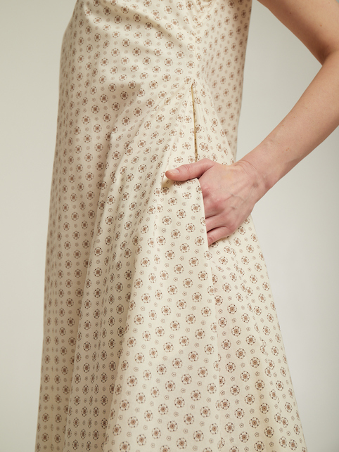 Довжина міді. Сукня має дві глибокі зустрічні складки з боків, в яких заховані зручні та практичні кишені.