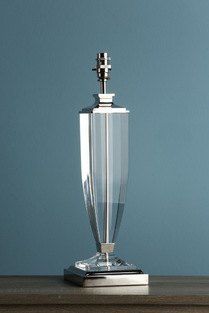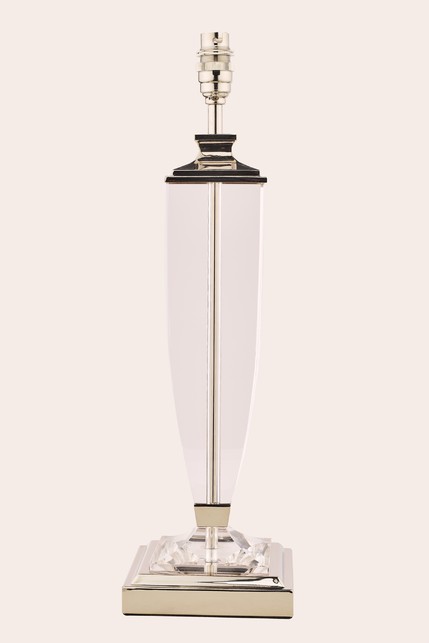 Велика база для настільної лампи з'єднує в собі два різних елемента, які додають класичного стилю, це метал кольору латуні і прозоре скло.