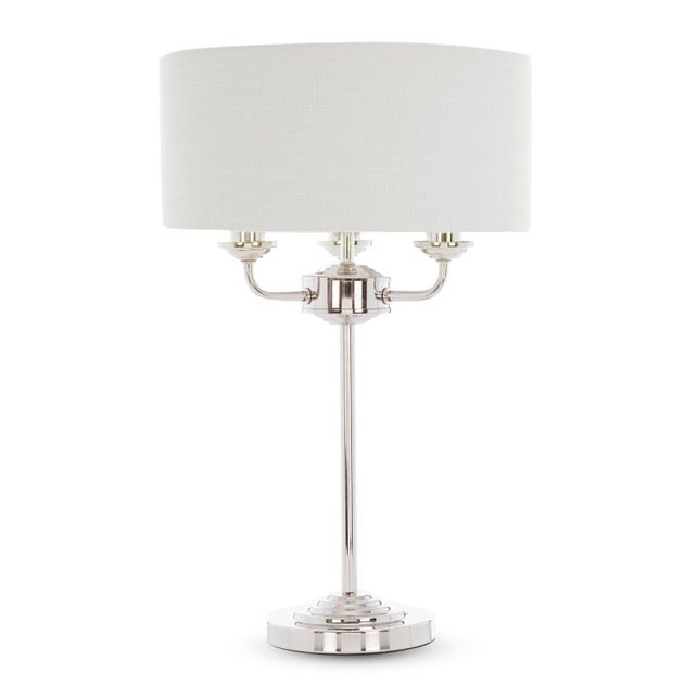 Красива настільна лампа на тонкій ніжці сріблястого кольору, лампа на три лампочки і одним широким абажуром білого кольору.