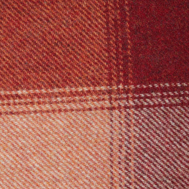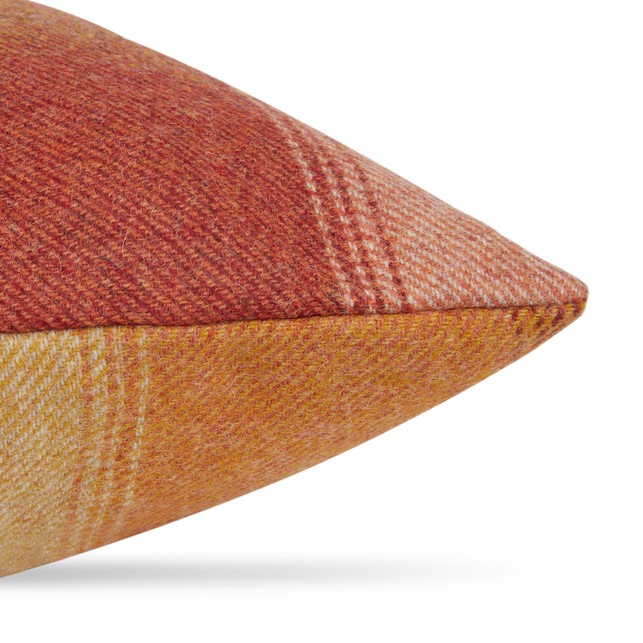 Красива декоративна подушка квадратної форми у велику клітку жовтогарячого, бордового, жовтого і бежевого відтінків.