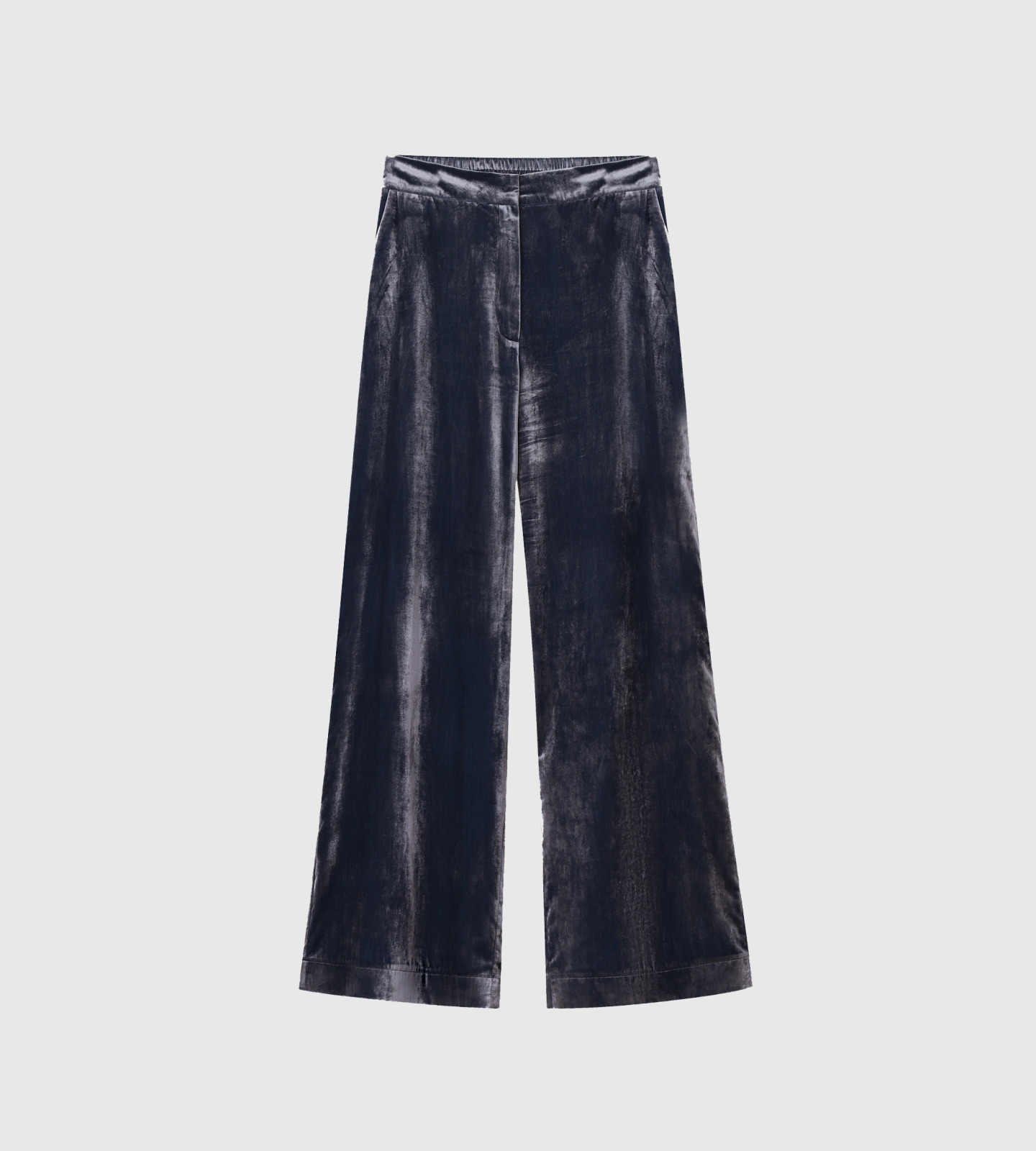 Виготовлені з м’якого благородного велюру, брюки мають характерний легкий блиск, що надає виробу святкового та вишуканого вигляду. Вільний крій забезпечує комфорт і свободу руху, а резинка по спинці пояса гарантує ідеальну посадку на фігурі без відчуття тиску.